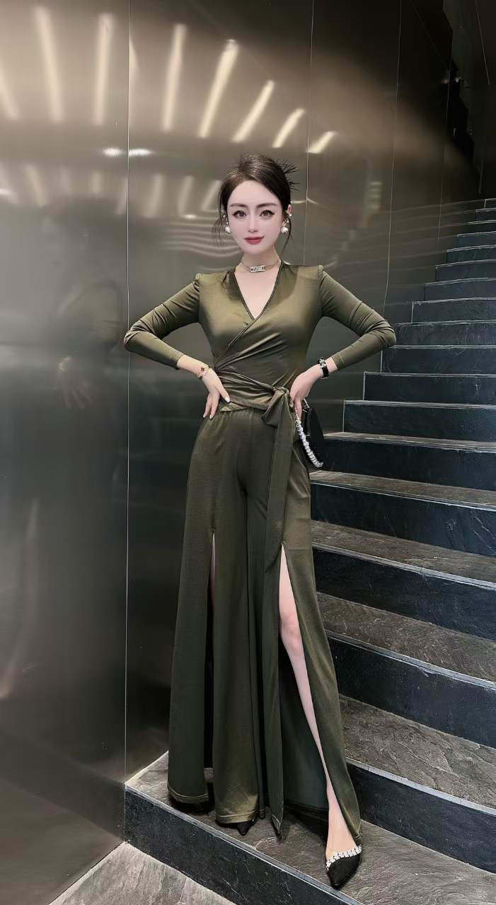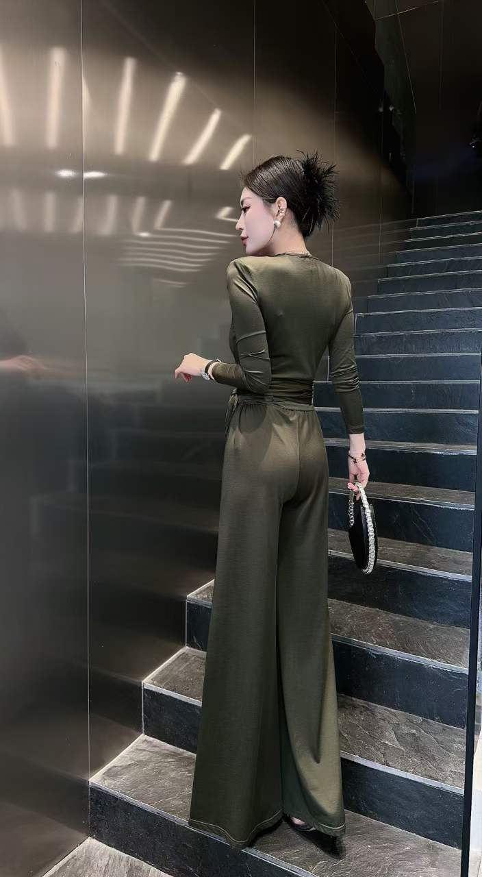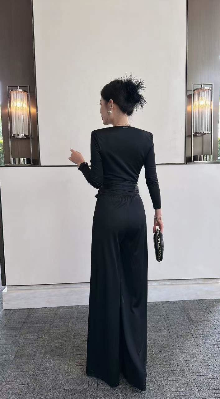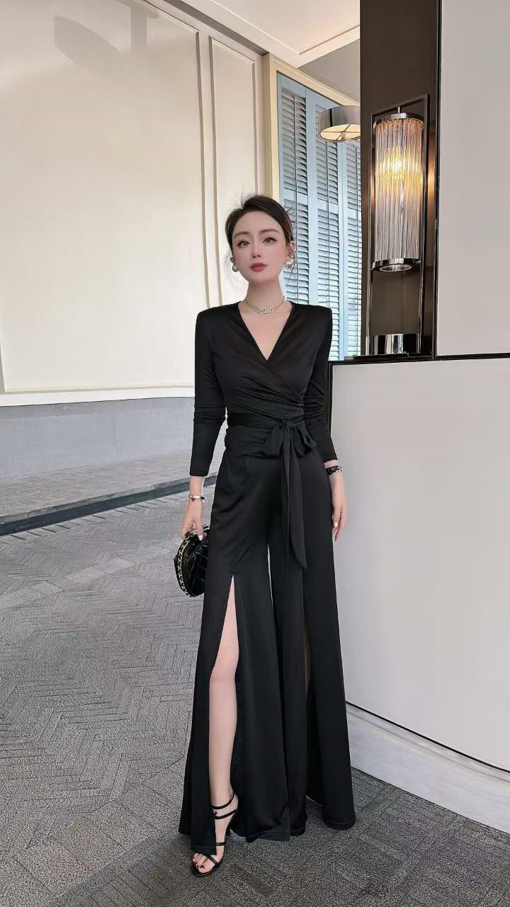 产品名称 | Product name: 时髦洋气套装裤女V领绑带上衣+开叉阔腿喇叭裤