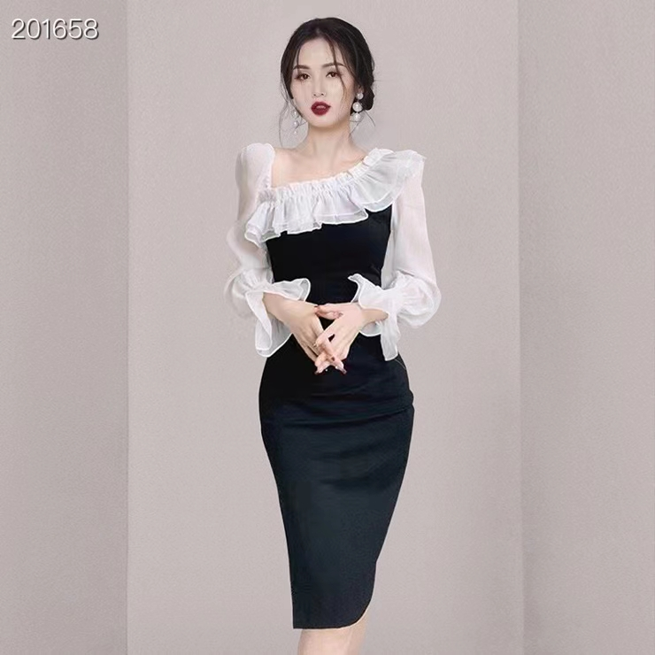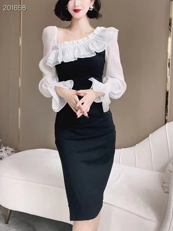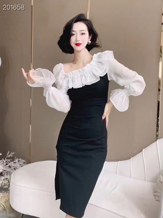 产品名称 | Product name: 2023 气质荷叶领名媛拼色修身连衣裙女