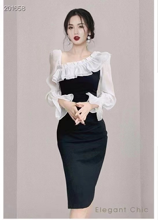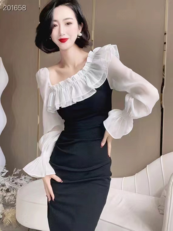 2023 气质荷叶领名媛拼色修身连衣裙女