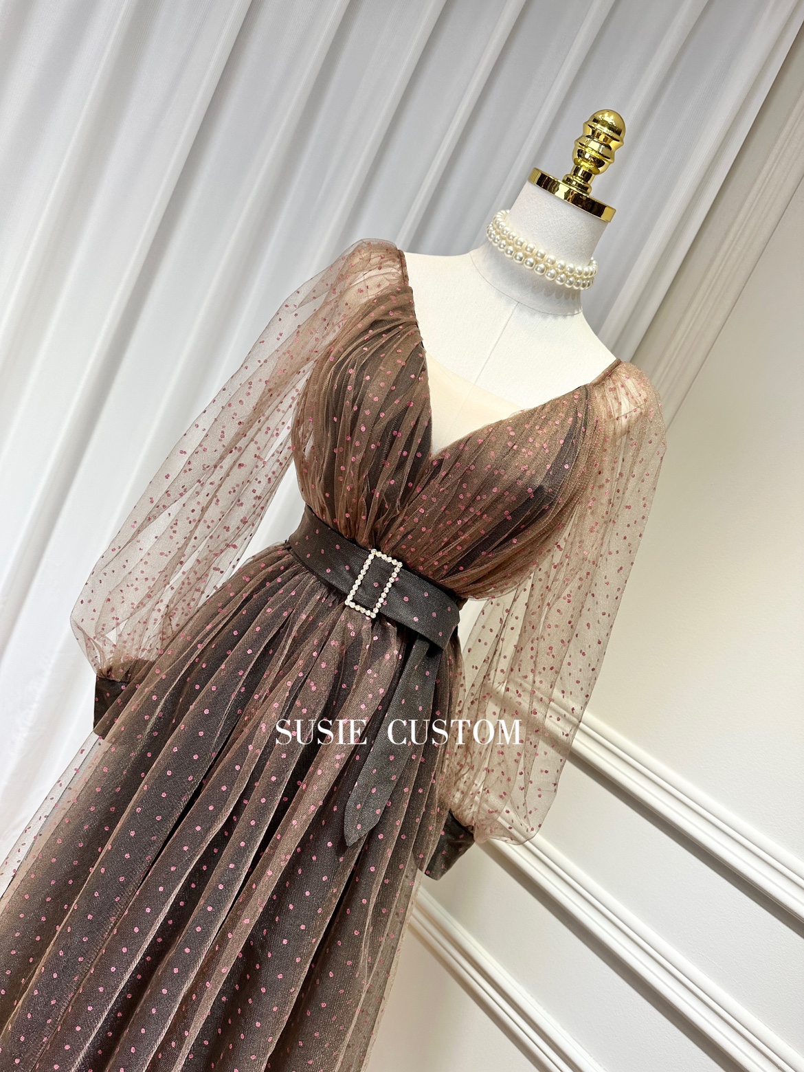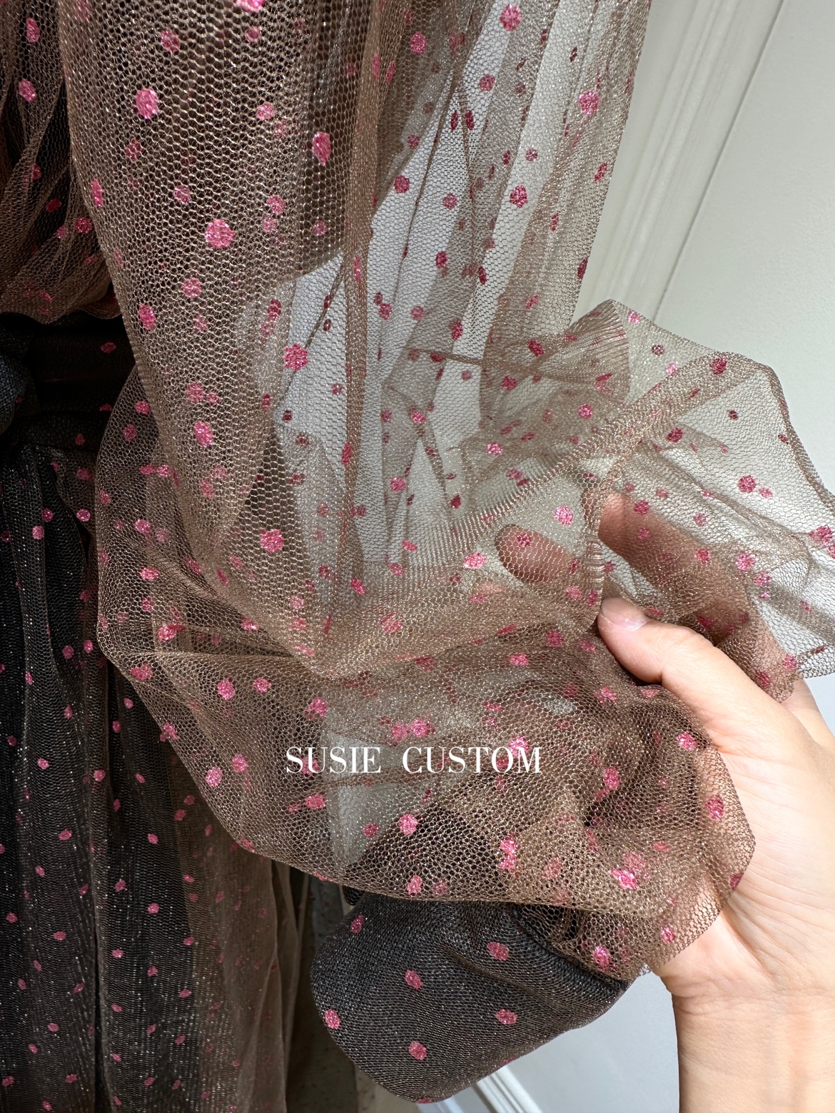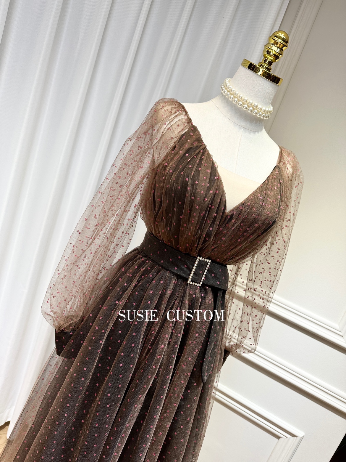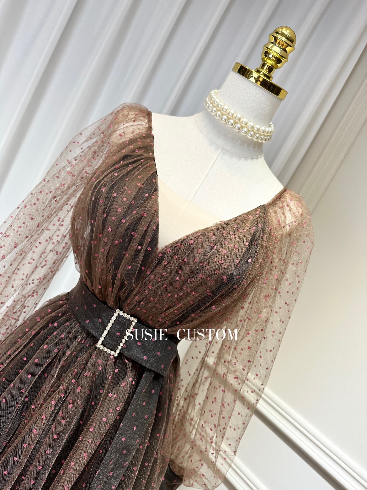 产品名称 | Product name: 高定复古法式闪闪波点透泡泡袖深V收腰配腰带蓬蓬网纱长裙礼服裙