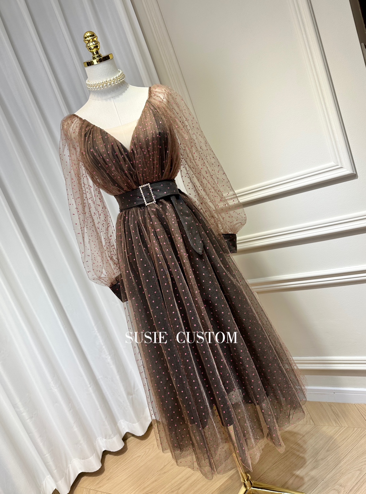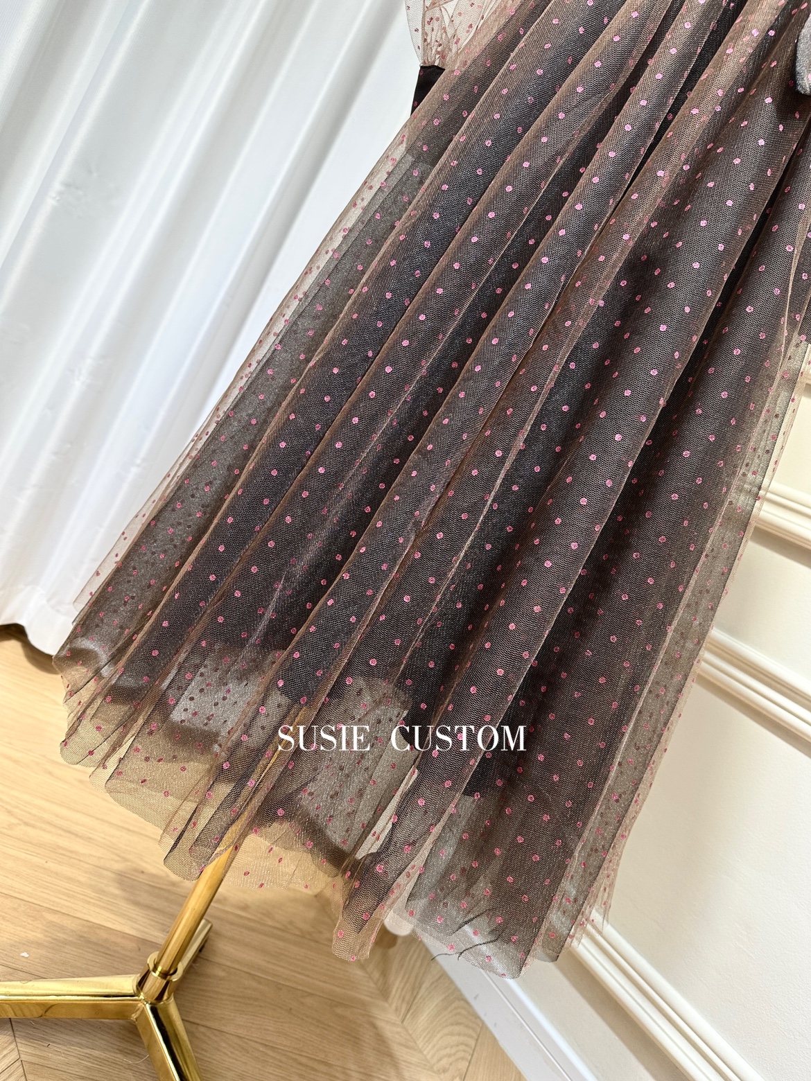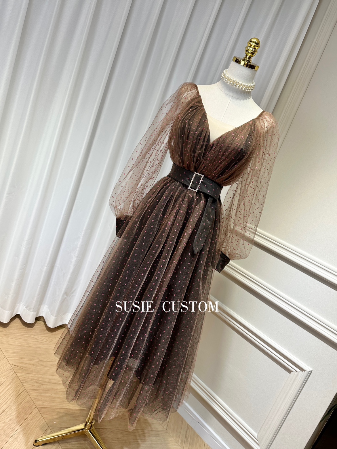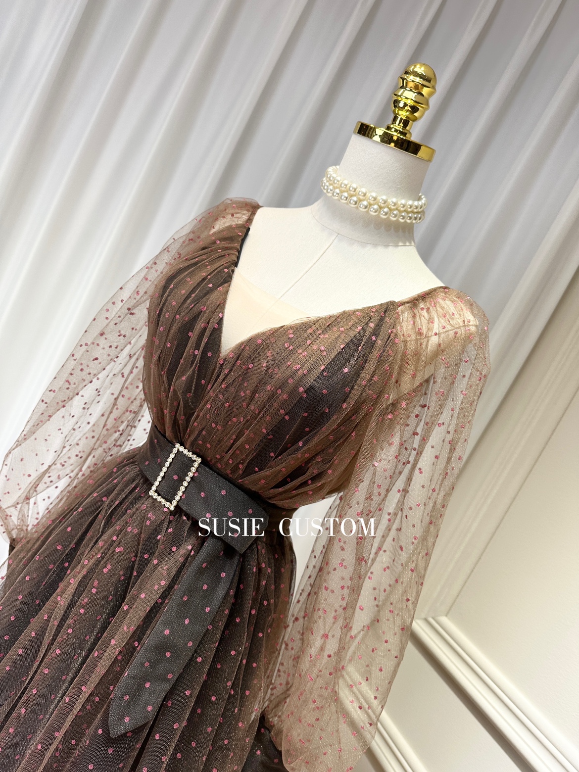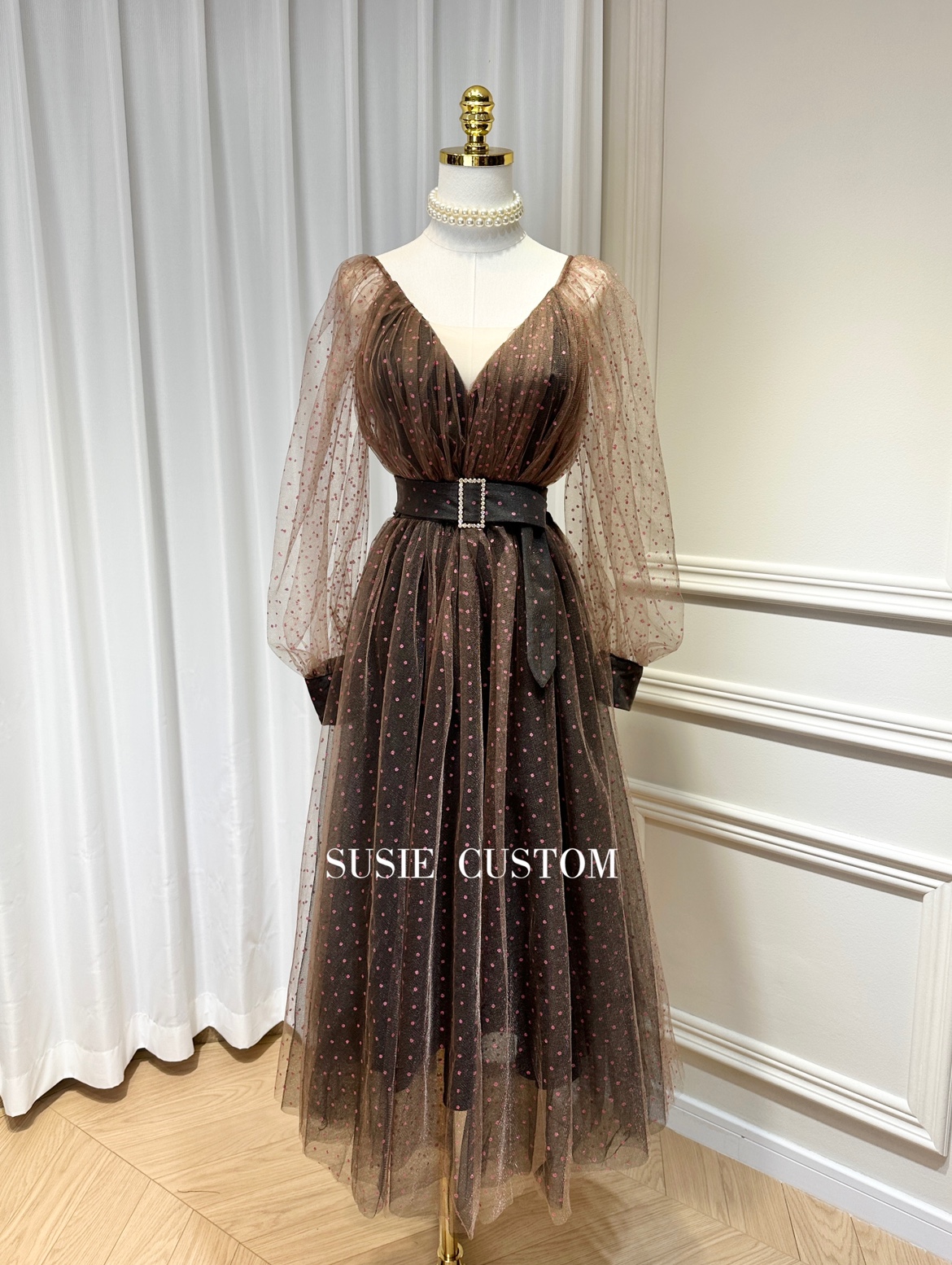 产品名称 | Product name: 高定复古法式闪闪波点透泡泡袖深V收腰配腰带蓬蓬网纱长裙礼服裙