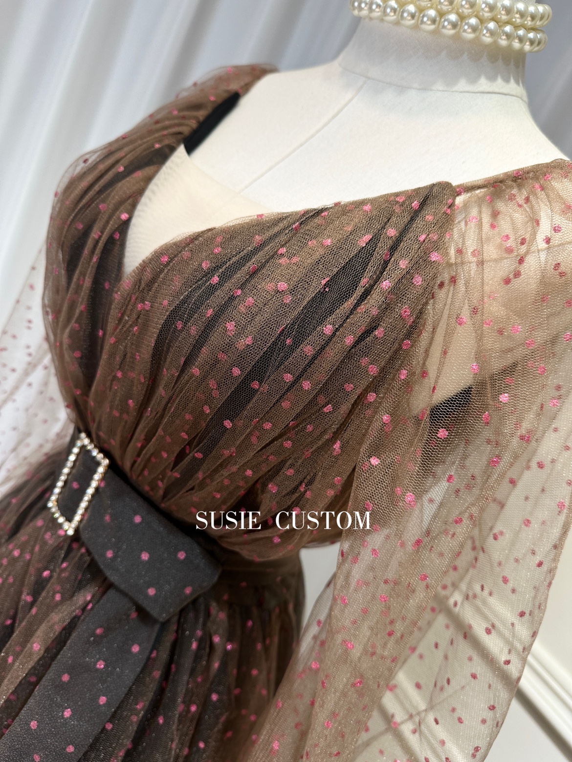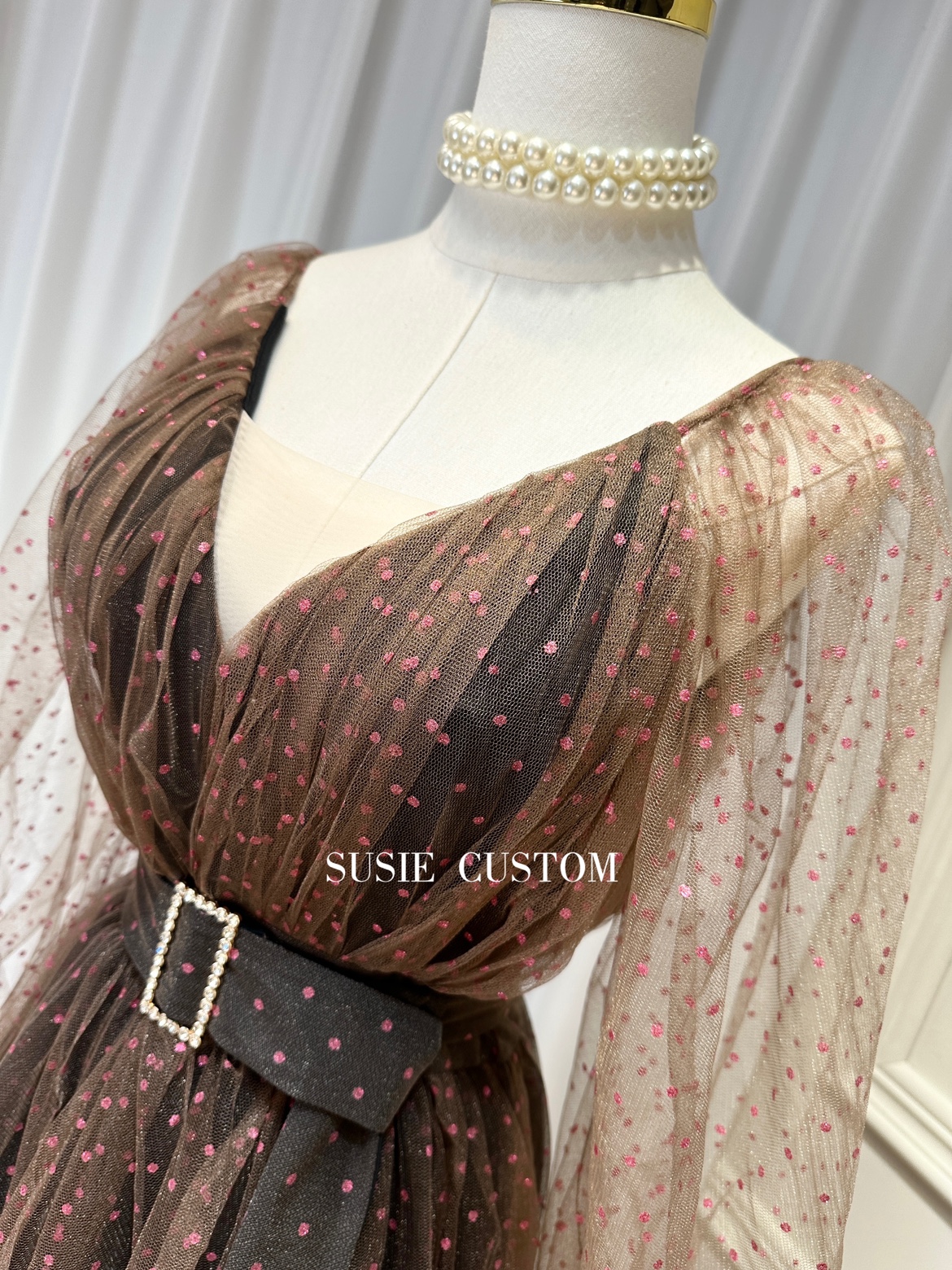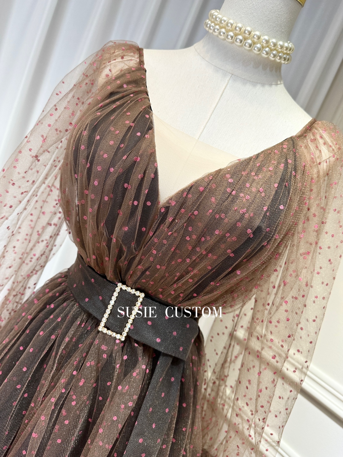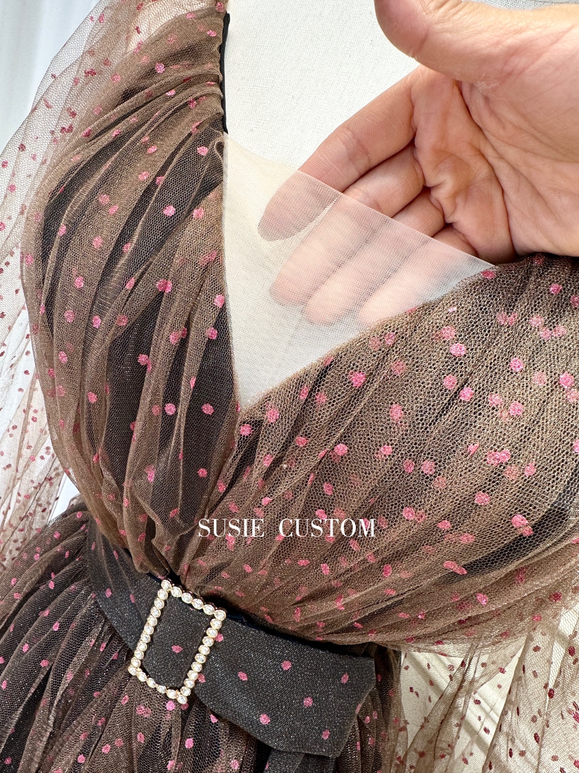 高定复古法式闪闪波点透泡泡袖深V收腰配腰带蓬蓬网纱长裙礼服裙