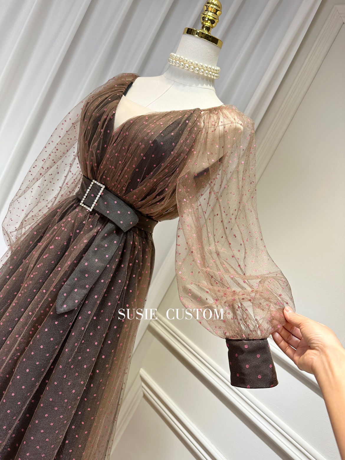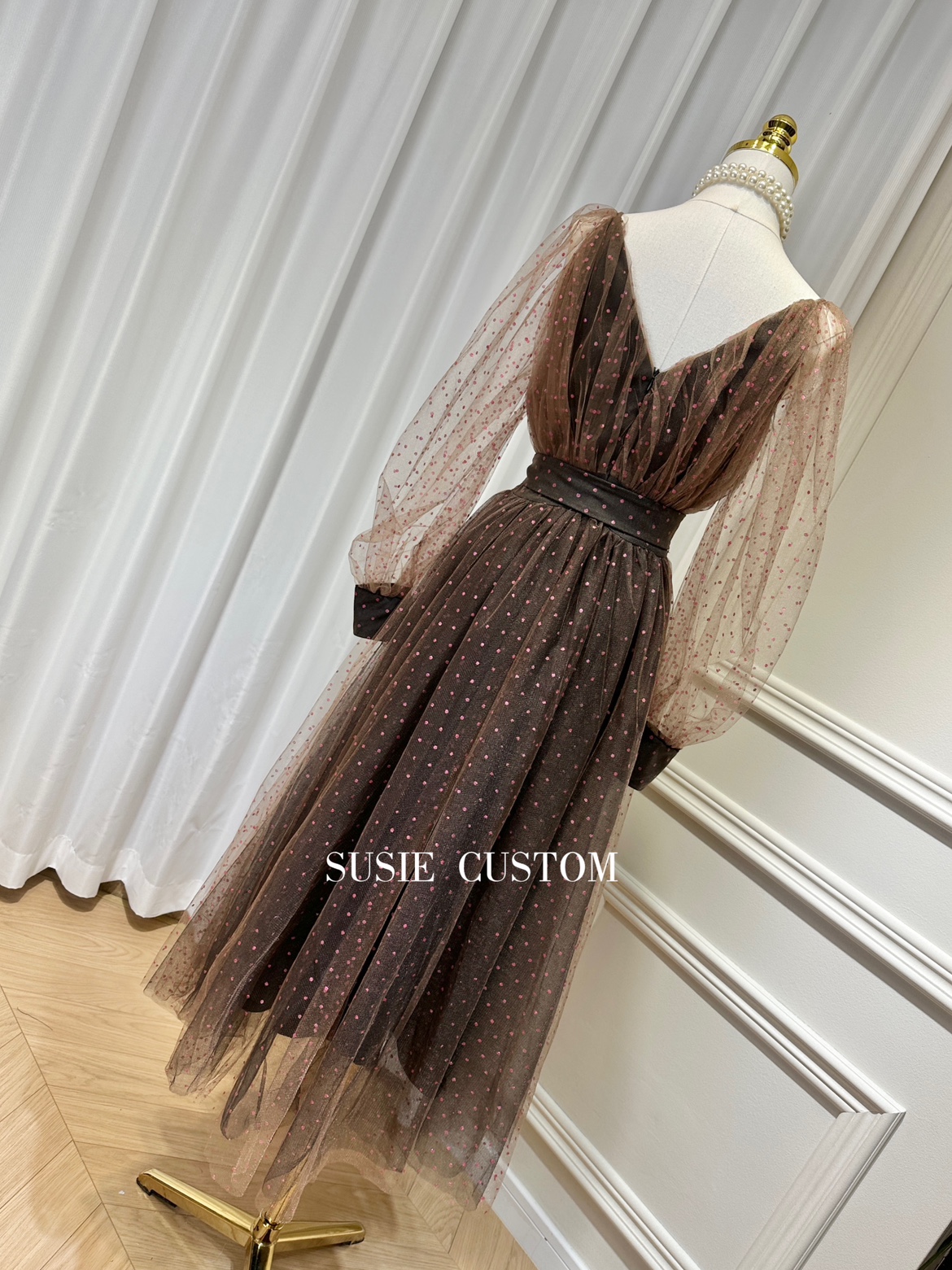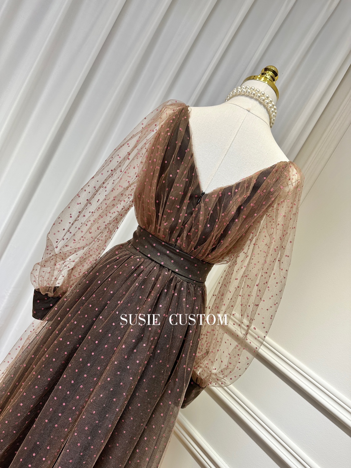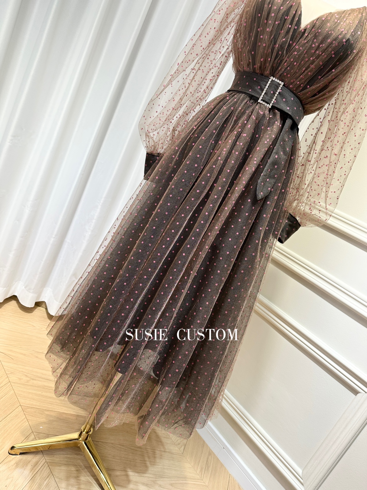 高定复古法式闪闪波点透泡泡袖深V收腰配腰带蓬蓬网纱长裙礼服裙