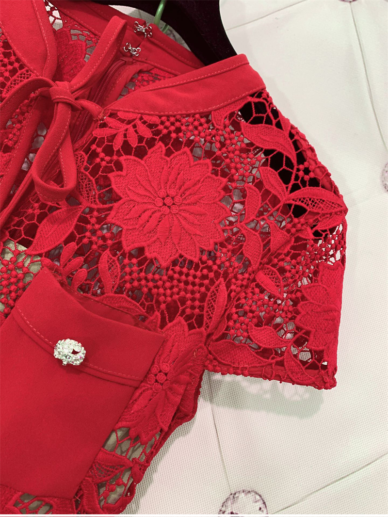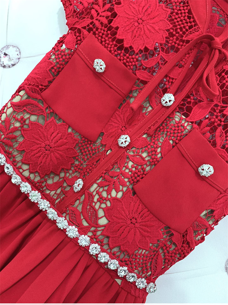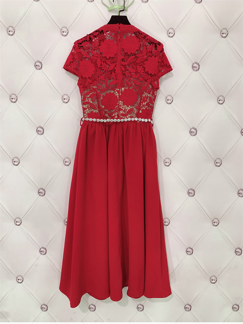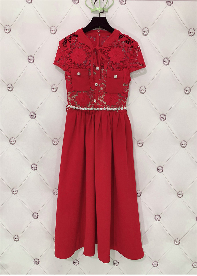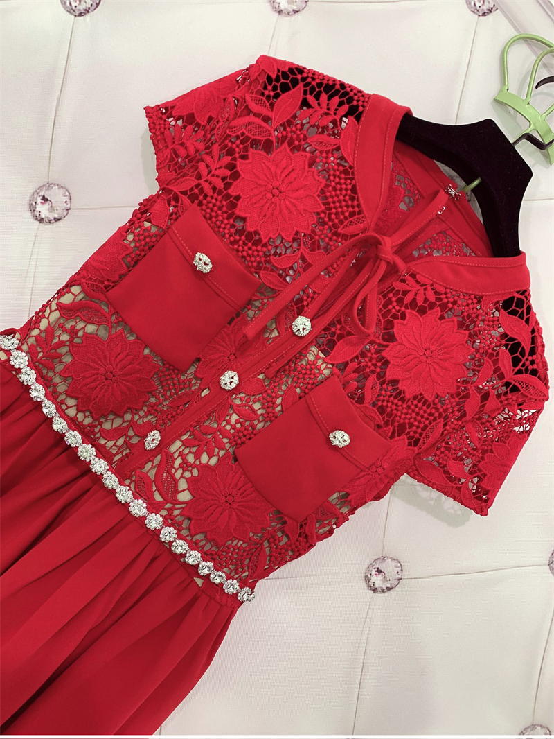 产品名称 | Product name: 高端尚重工刺绣蕾丝镶钻系带连衣裙女欧货夏季新款法式气质长裙