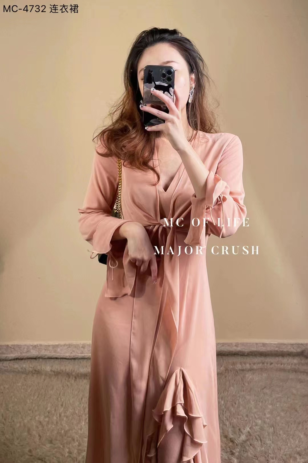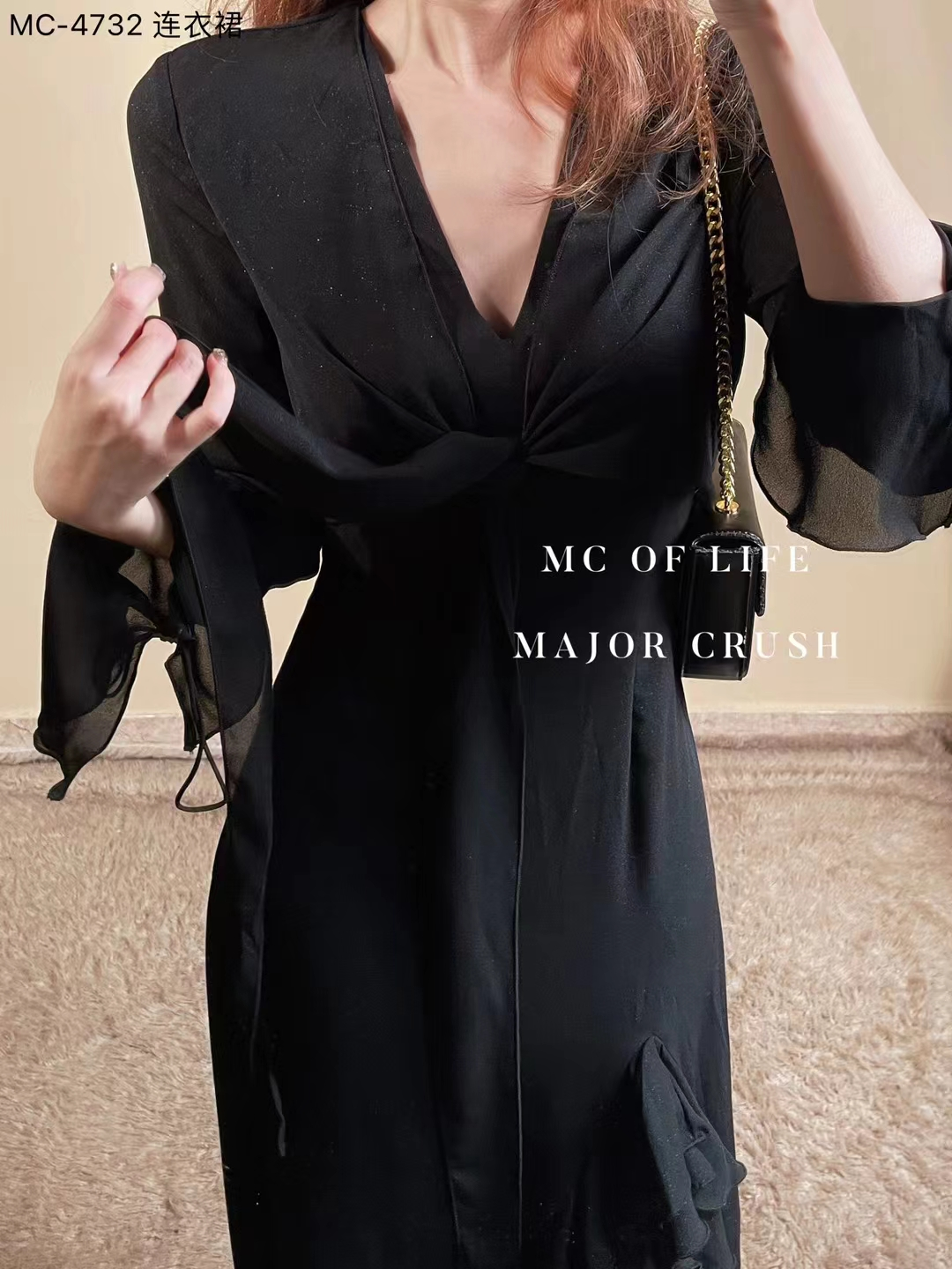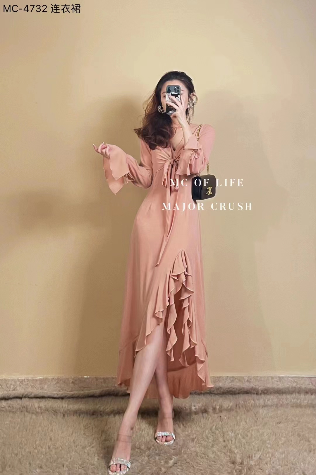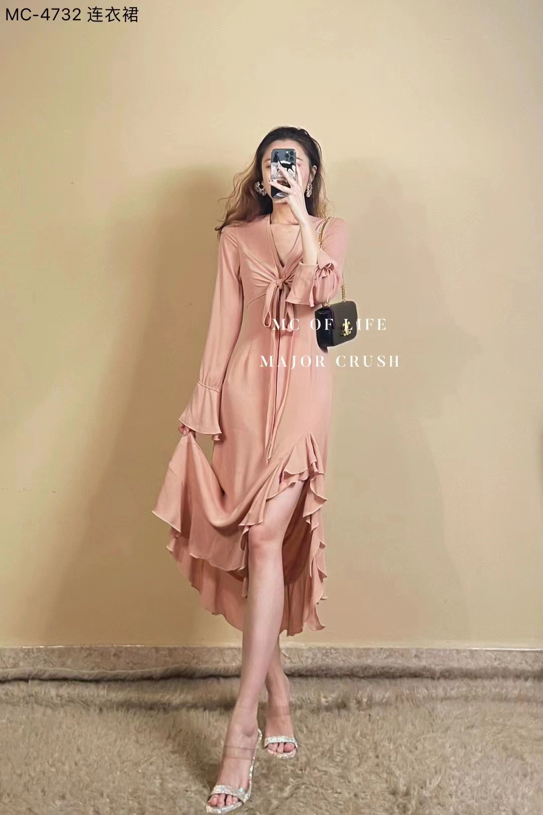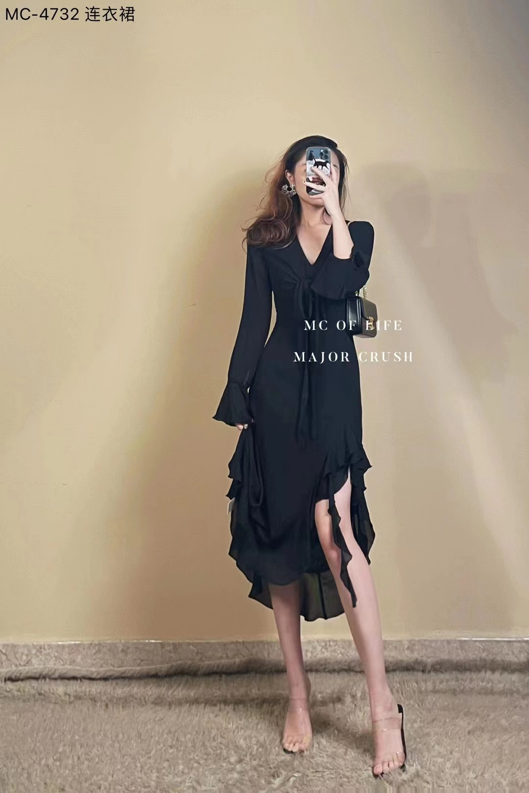 产品名称 | Product name: 超仙垂感木耳边茶歇连衣裙不规则裙摆23年新款小众设计