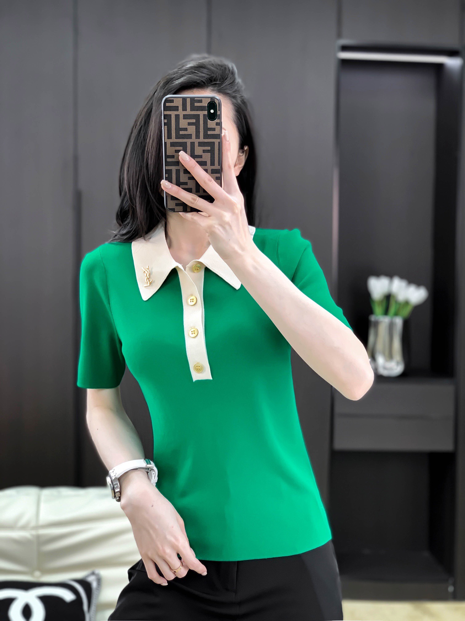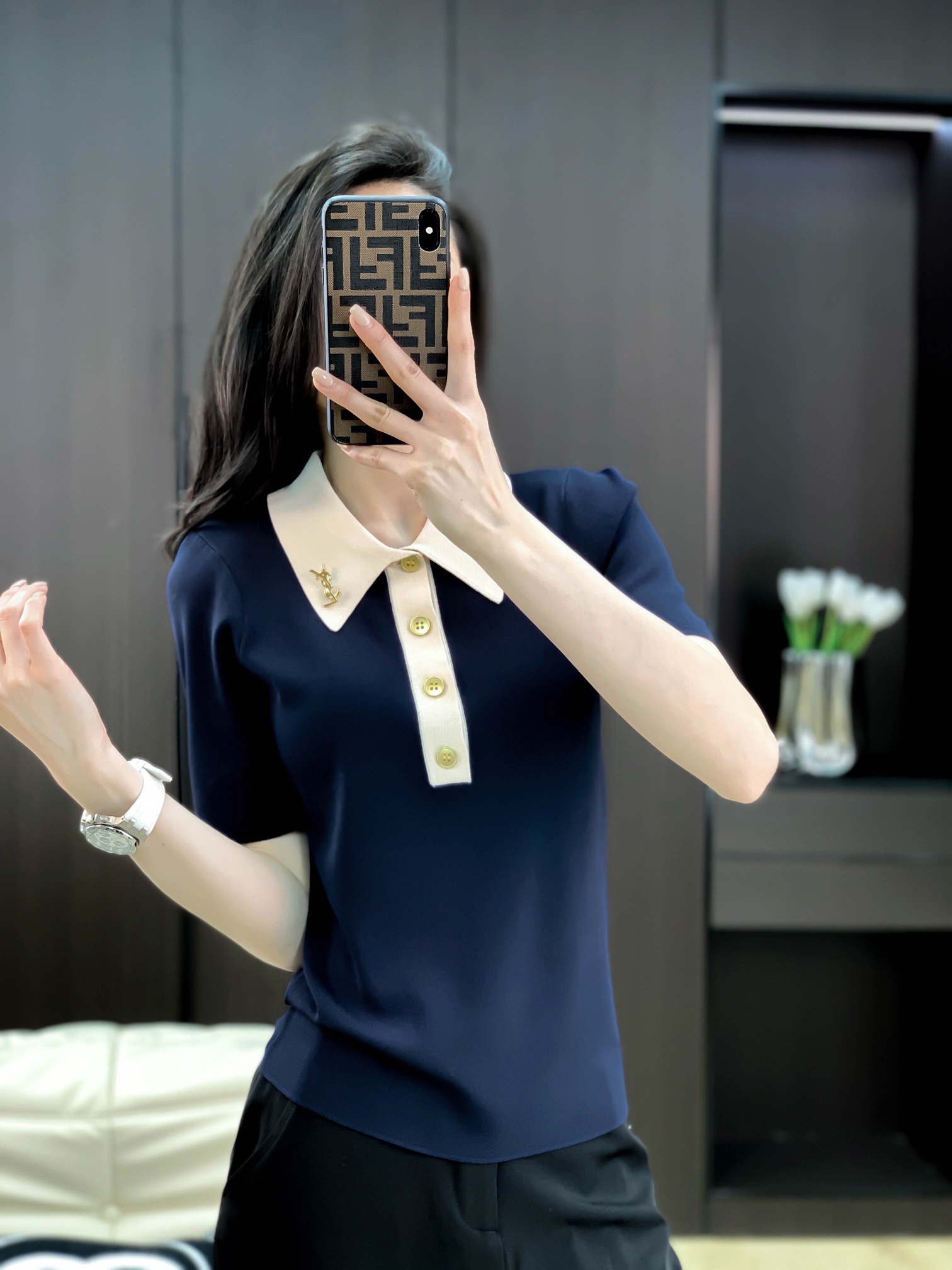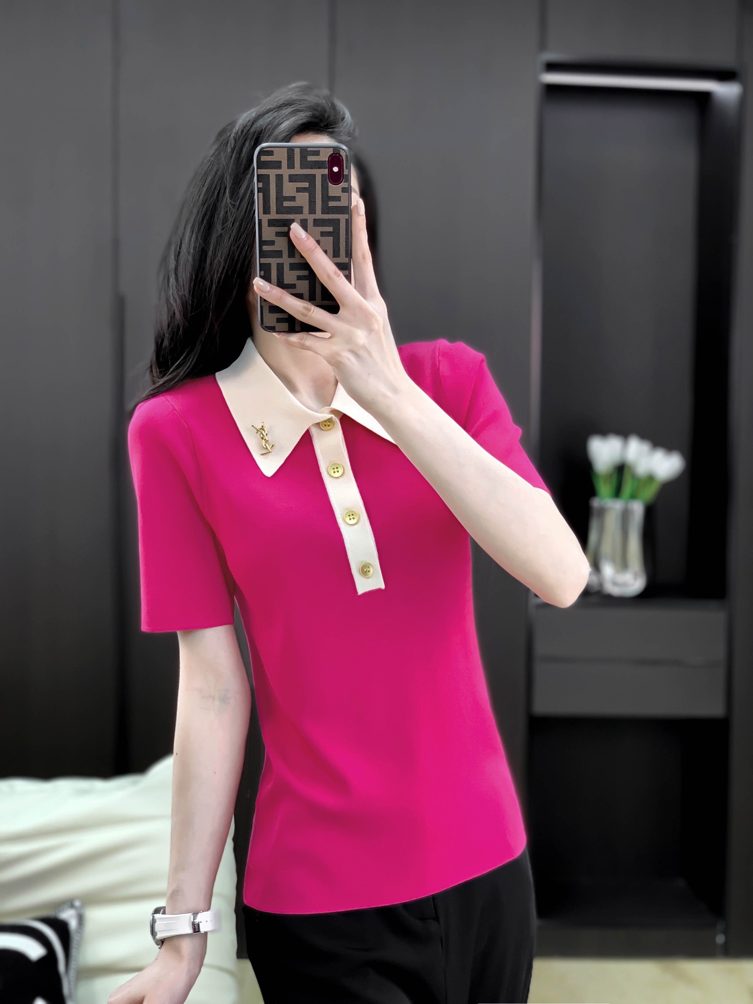 爆款:18é’ˆæžç»†å¤©ä¸çº±å®šåˆ¶YSL胸针撞色领上衣5704#