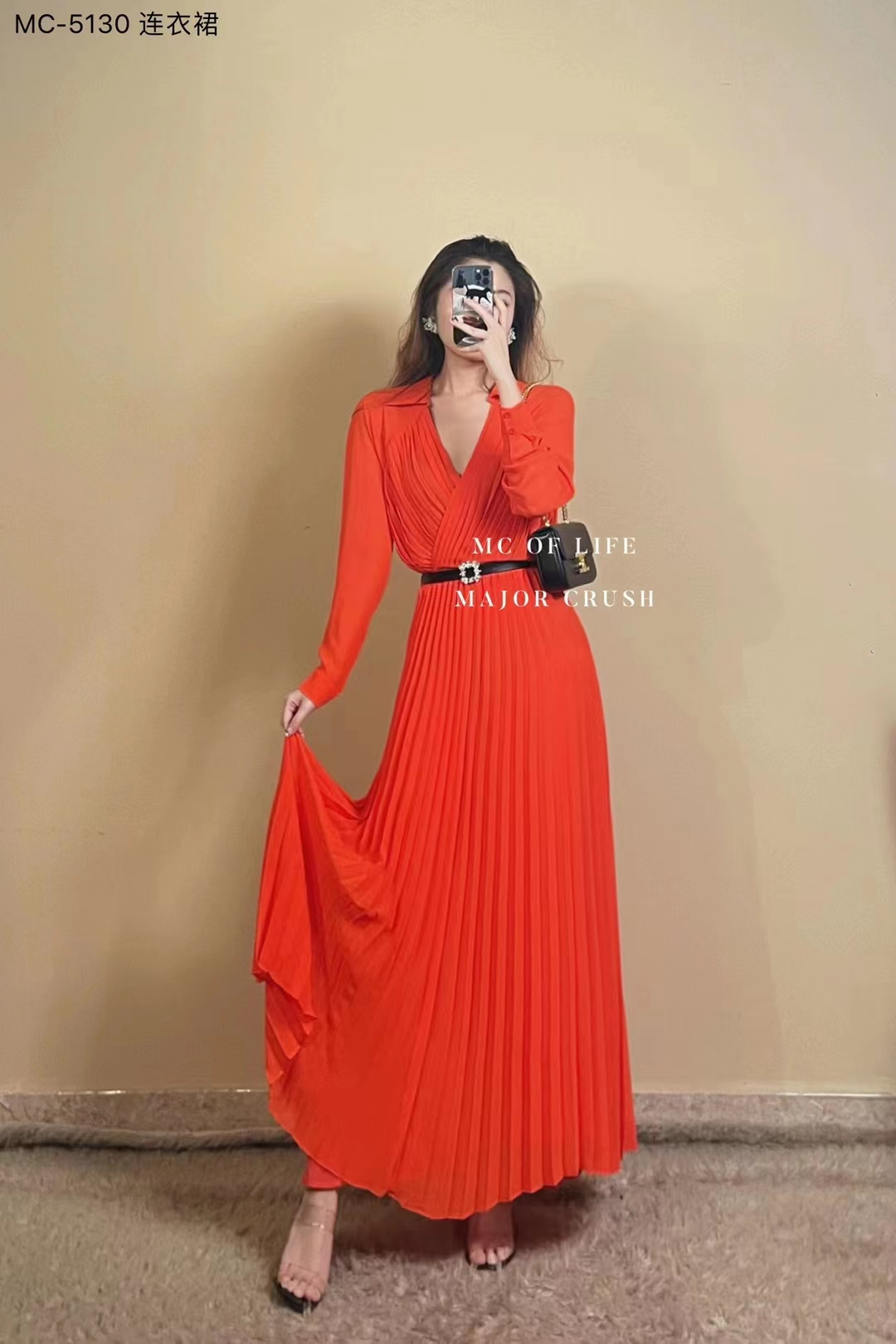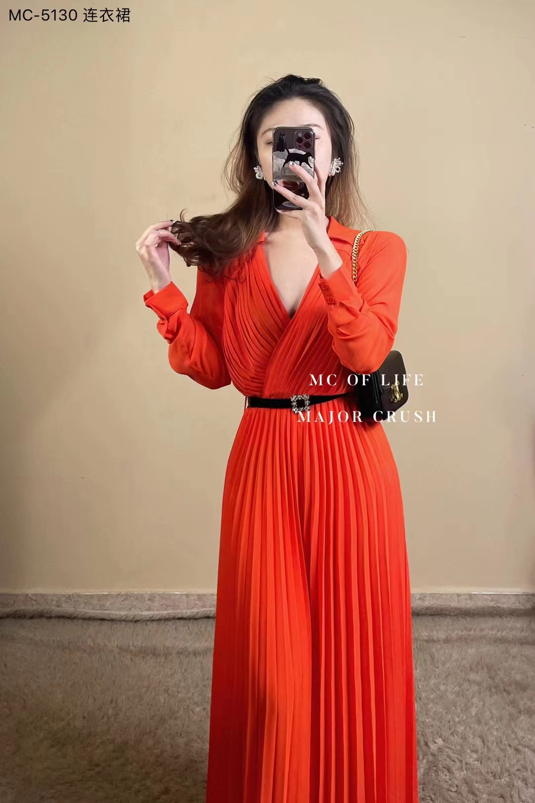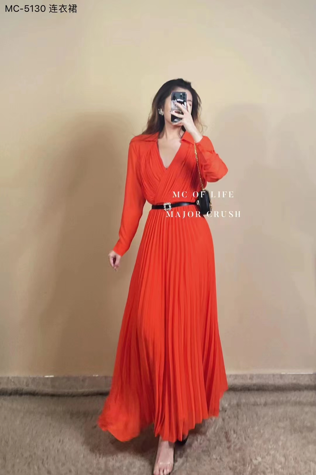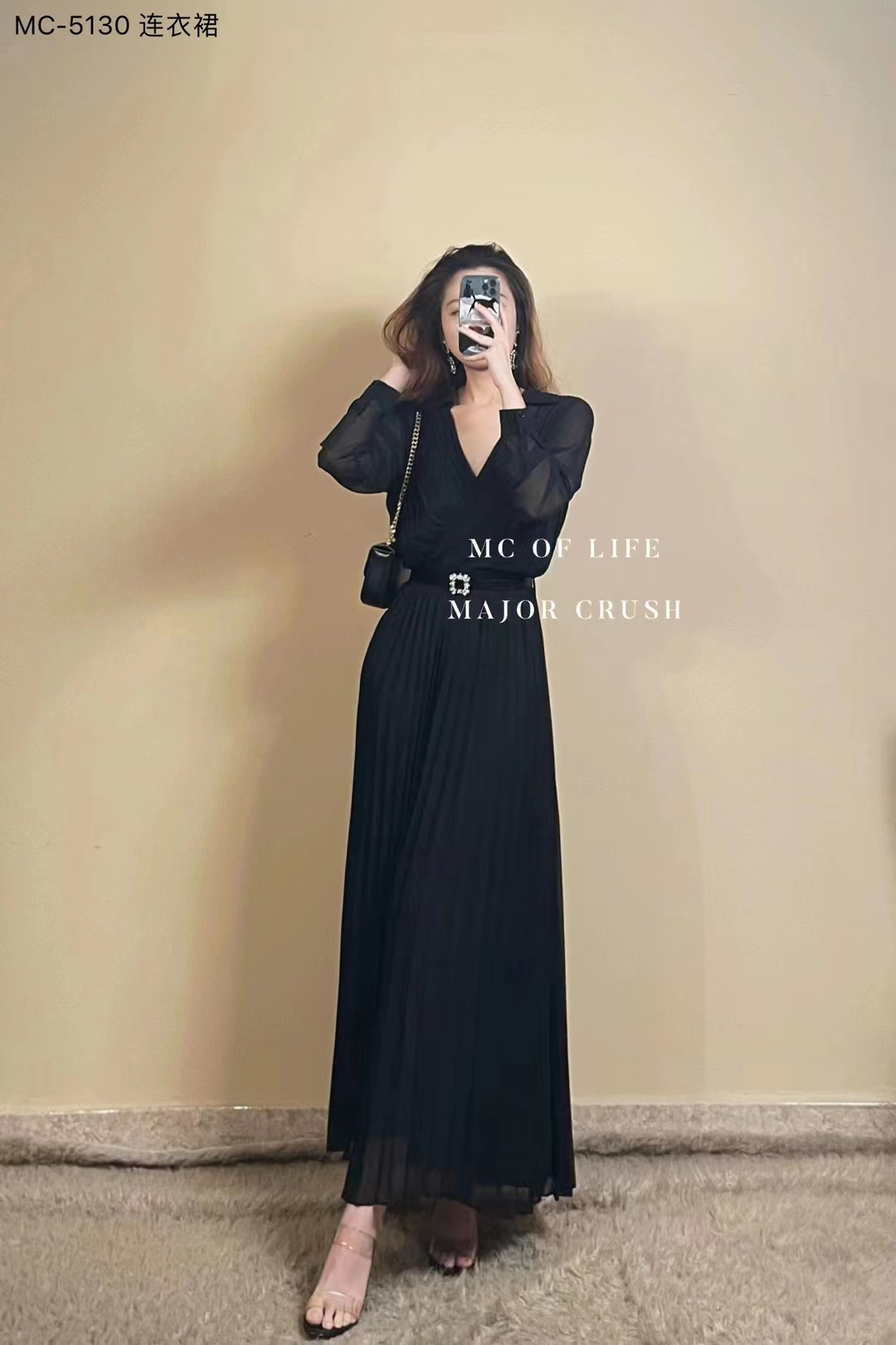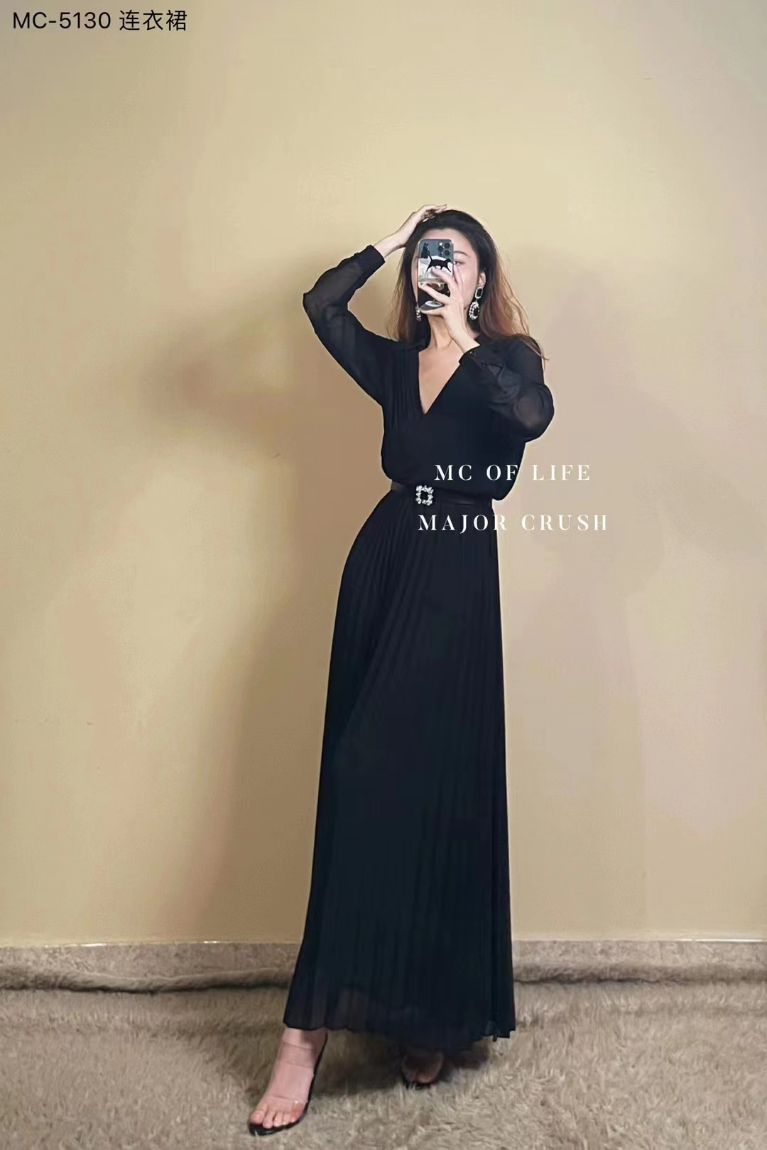 产品名称 | Product name: MC 2023春季新款V领长袖时尚百褶长裙重工气质连衣裙夏