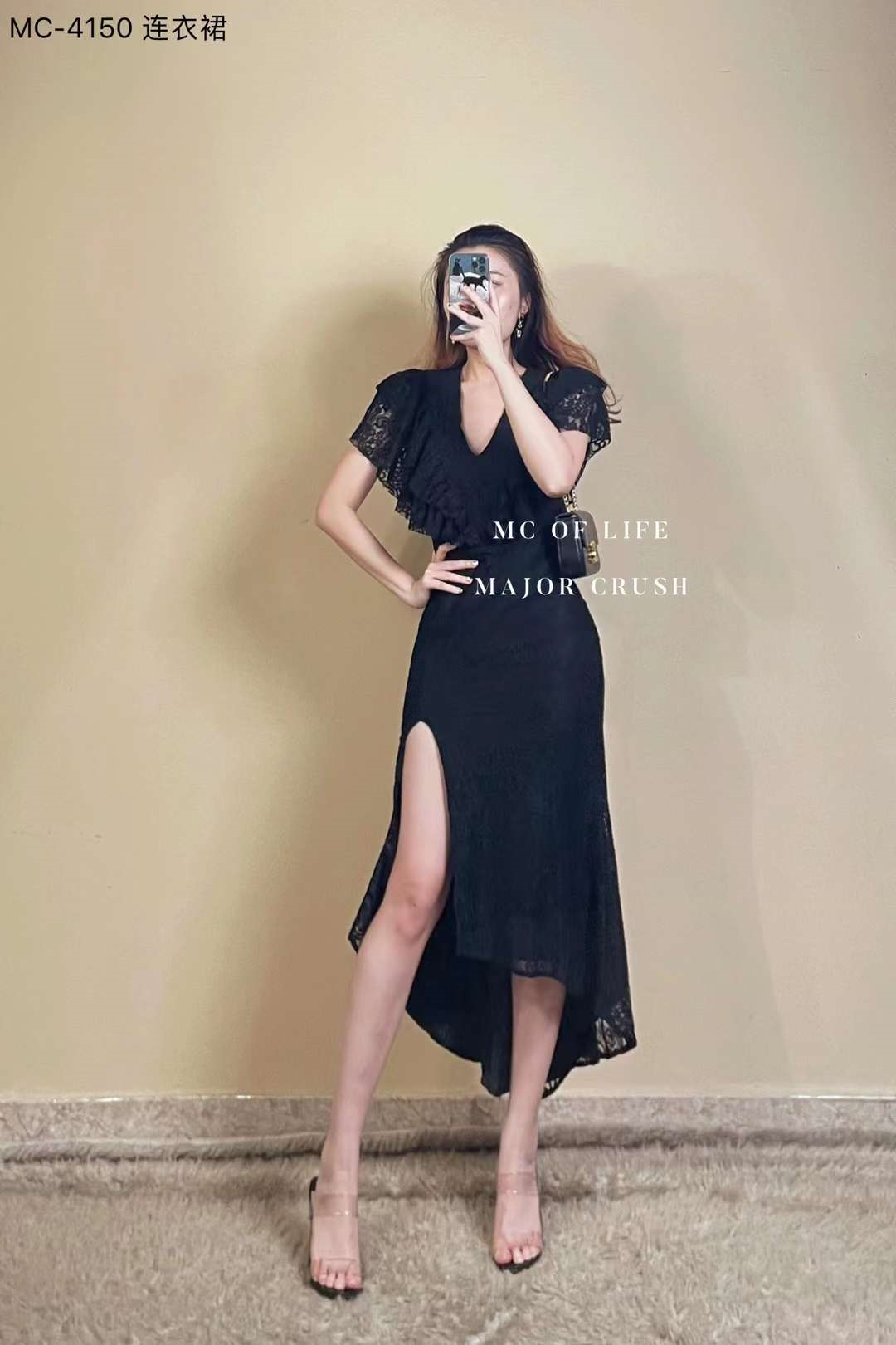产品名称 | Product name: MC2023夏季新款V领蕾丝花边气质修身显瘦开叉不等边连衣裙女
