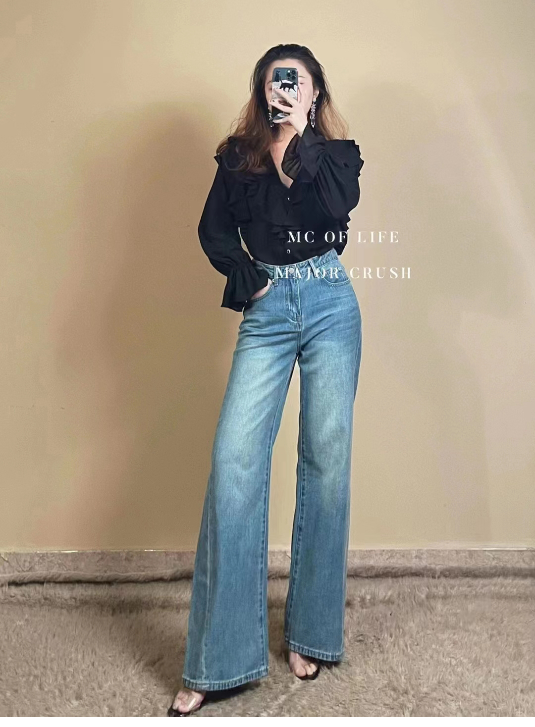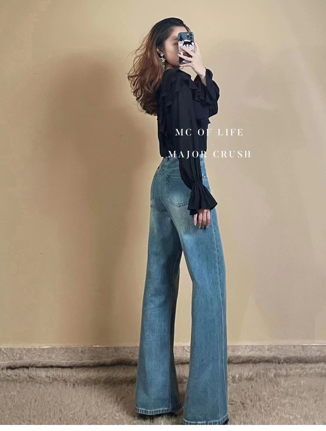 MC春夏新款高端原创小众重工牛仔裤女高腰百搭喇叭裤阔腿裤
