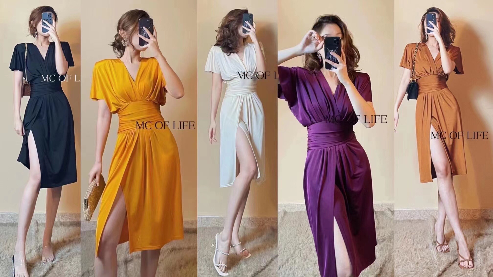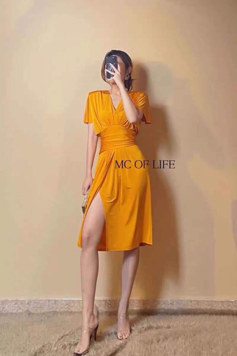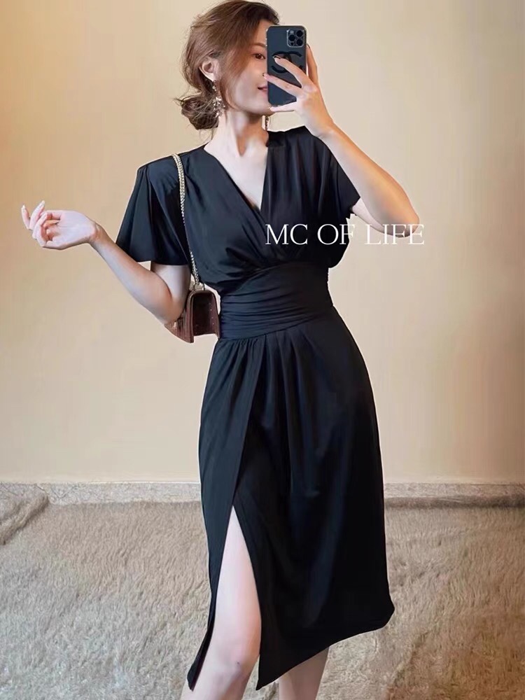 产品名称 | Product name: MC法式V领收腰开叉连衣裙女气质显瘦