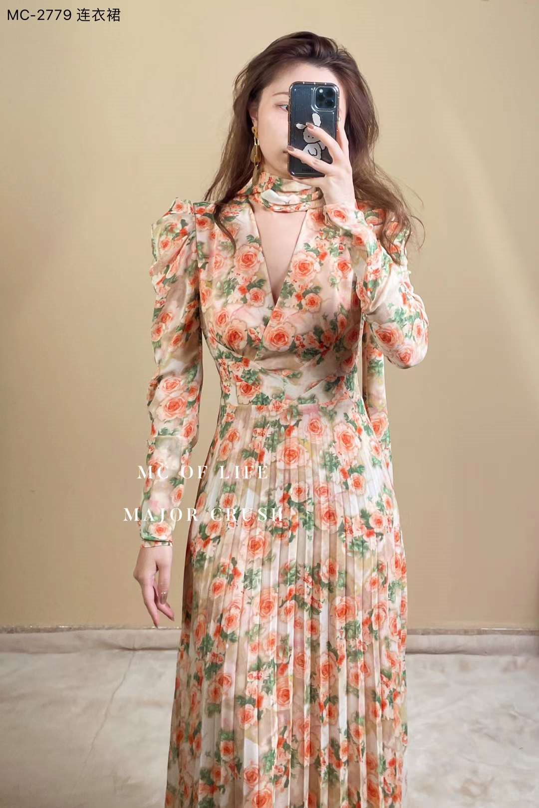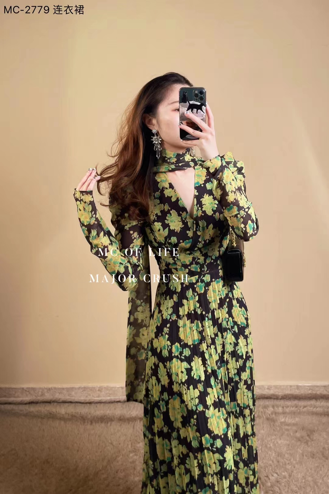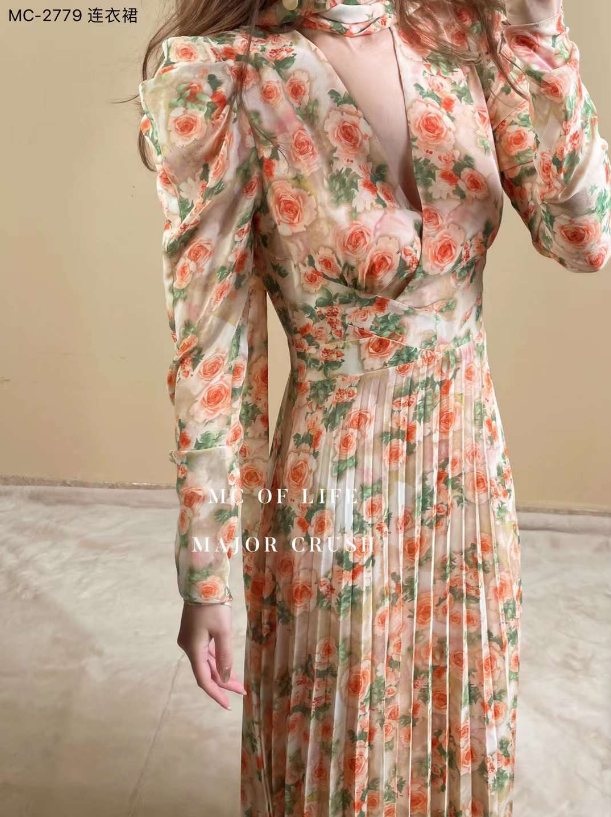 产品名称 | Product name: MC原创设计师 2023早春新款女装气质高雅印花真丝百褶连衣裙