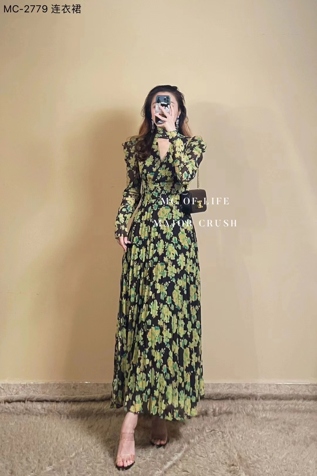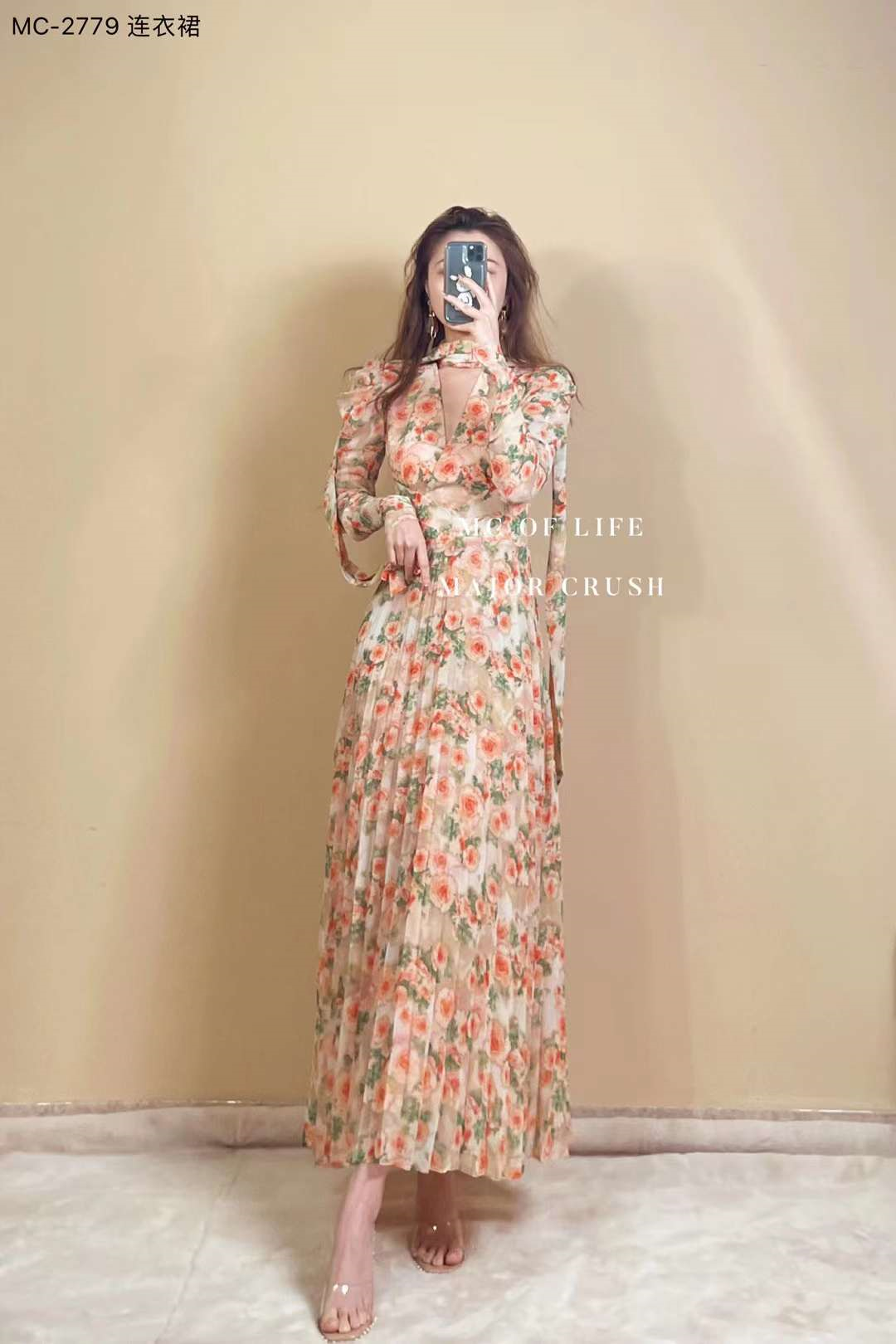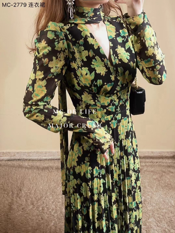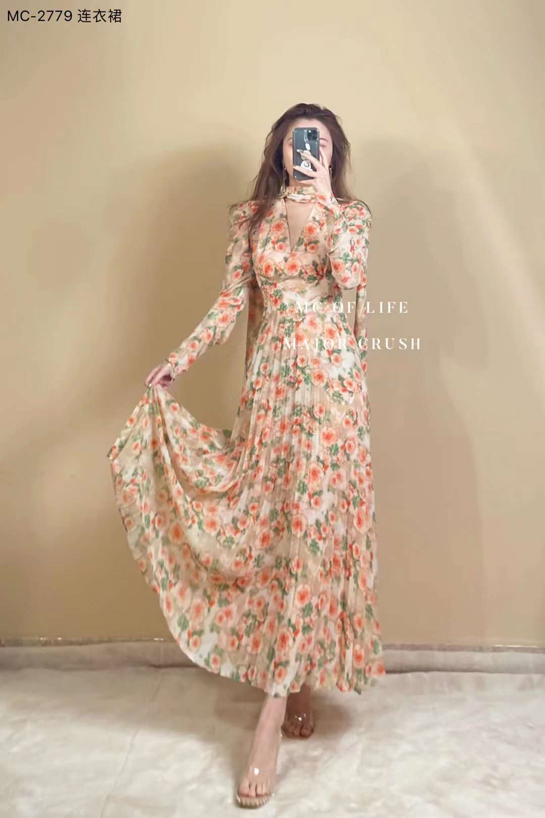 产品名称 | Product name: MC原创设计师 2023早春新款女装气质高雅印花真丝百褶连衣裙