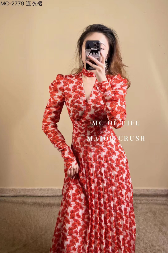 MC原创设计师 2023早春新款女装气质高雅印花真丝百褶连衣裙