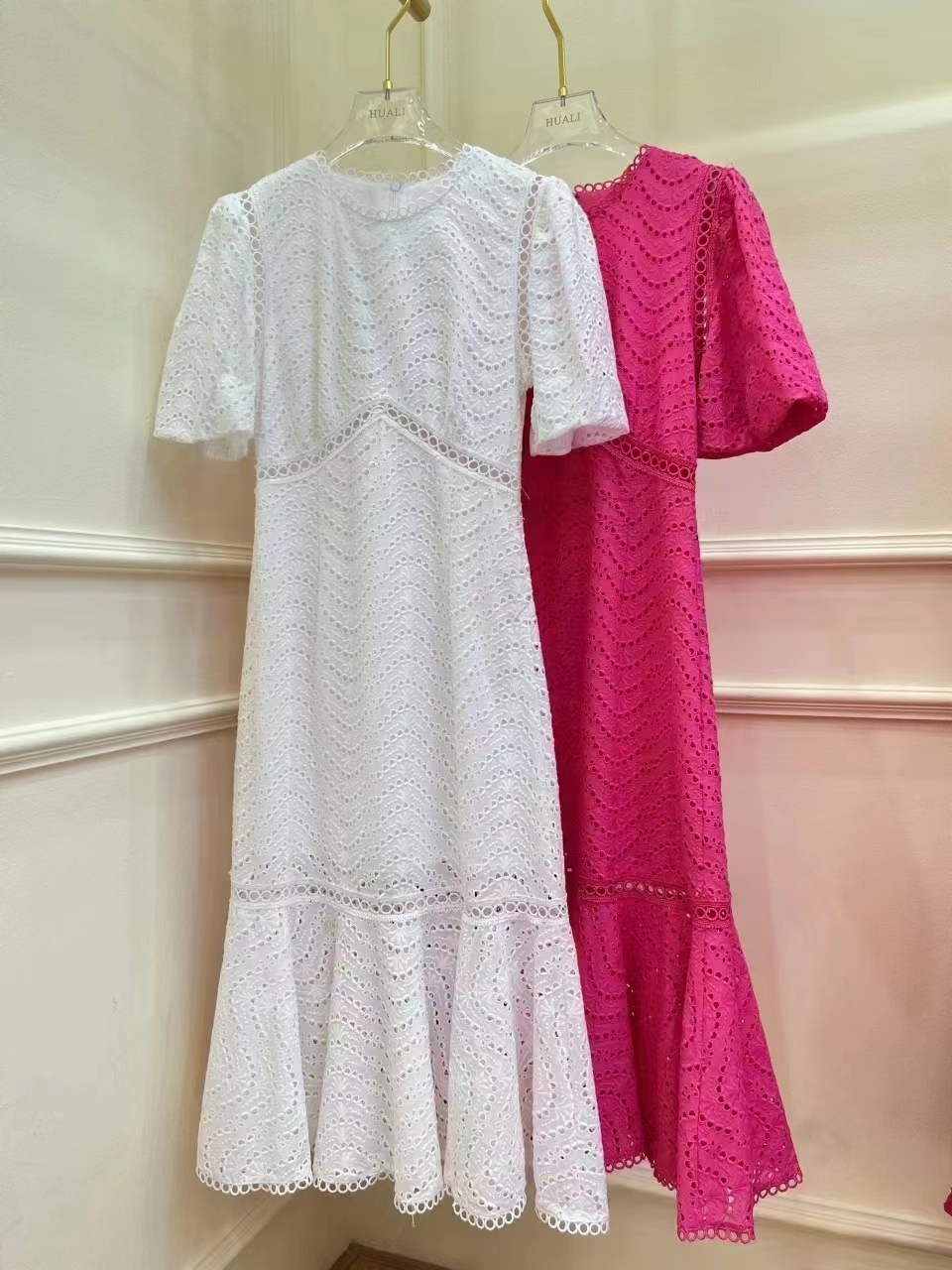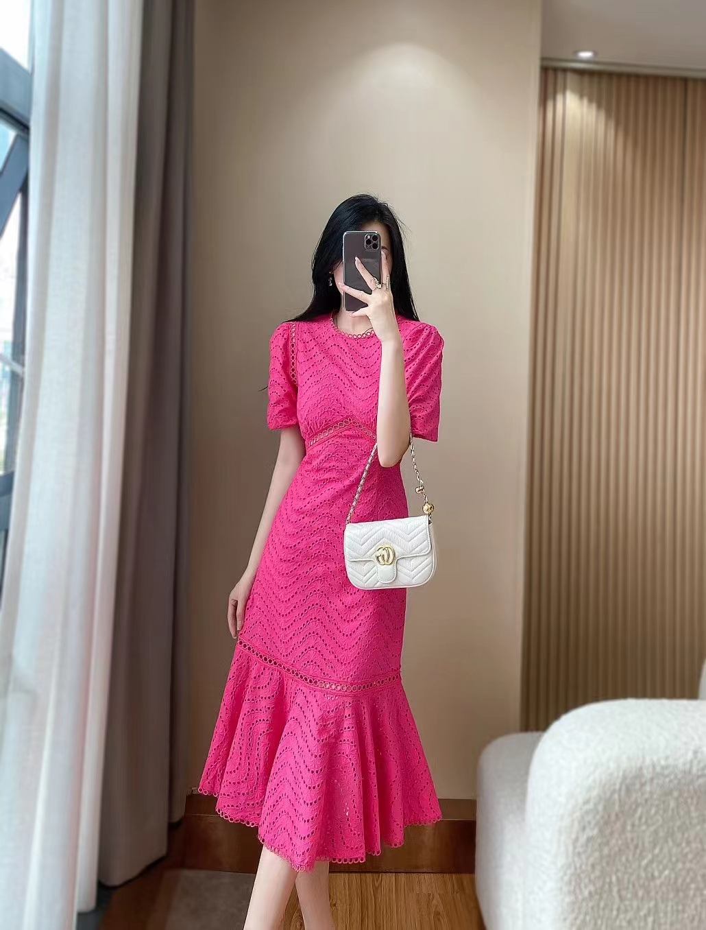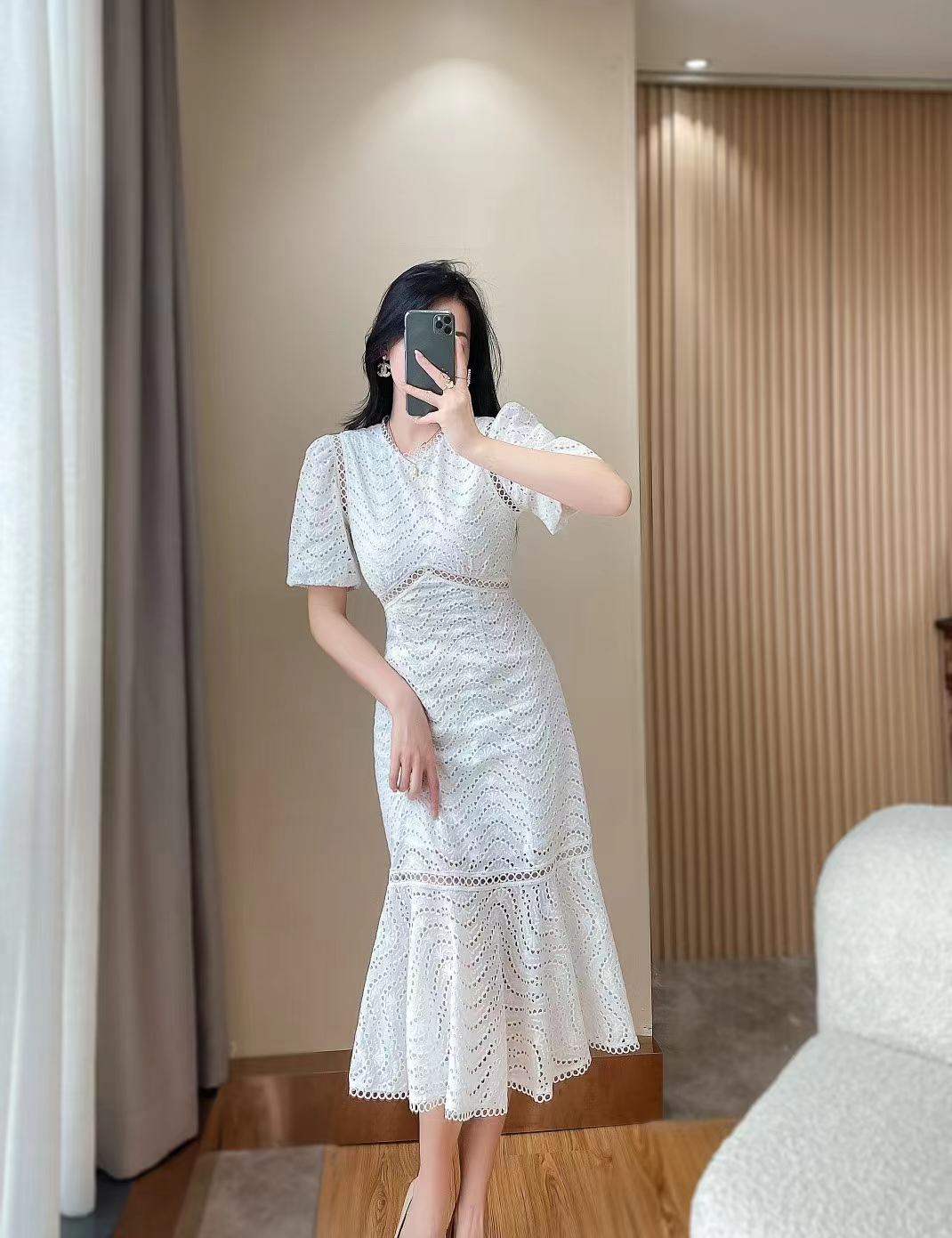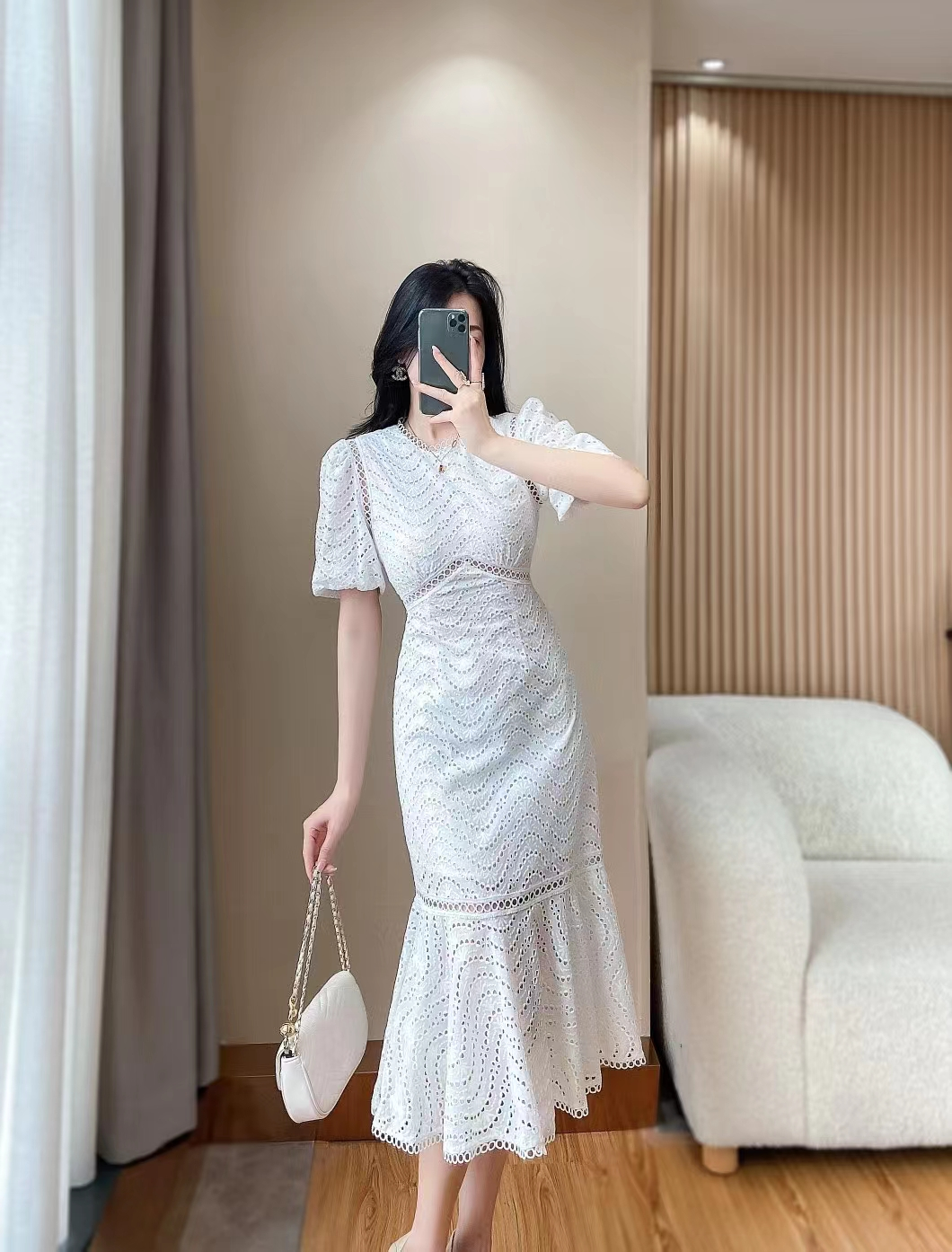 产品名称 | Product name: DIOR 水溶蕾丝泡泡袖修身显瘦波浪蕾丝包臀鱼尾连衣裙女