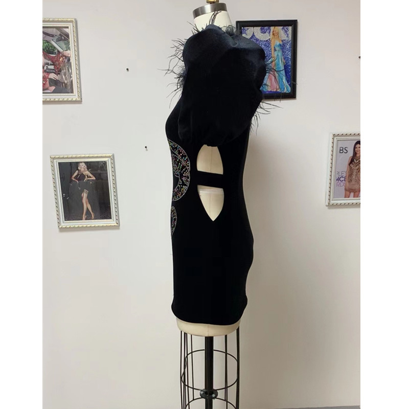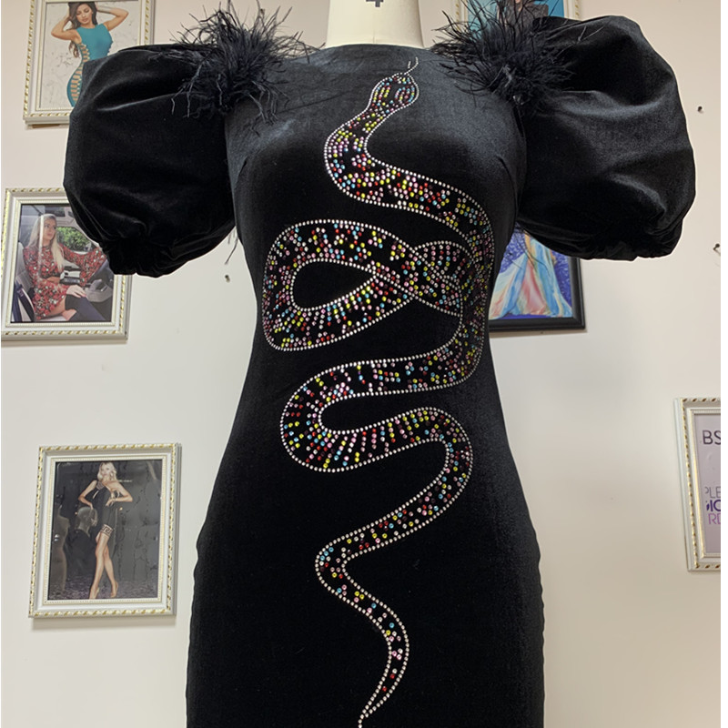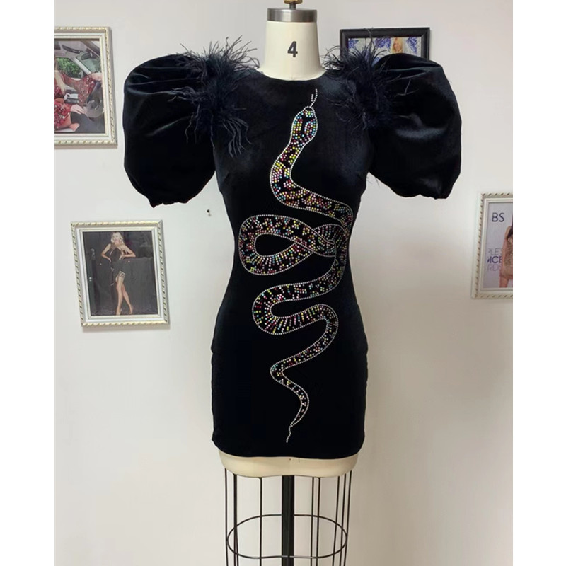 产品名称 | Product name: 黑色丝绒蛇型烫钻羽毛短袖修身连衣裙气质名缓交际小礼服