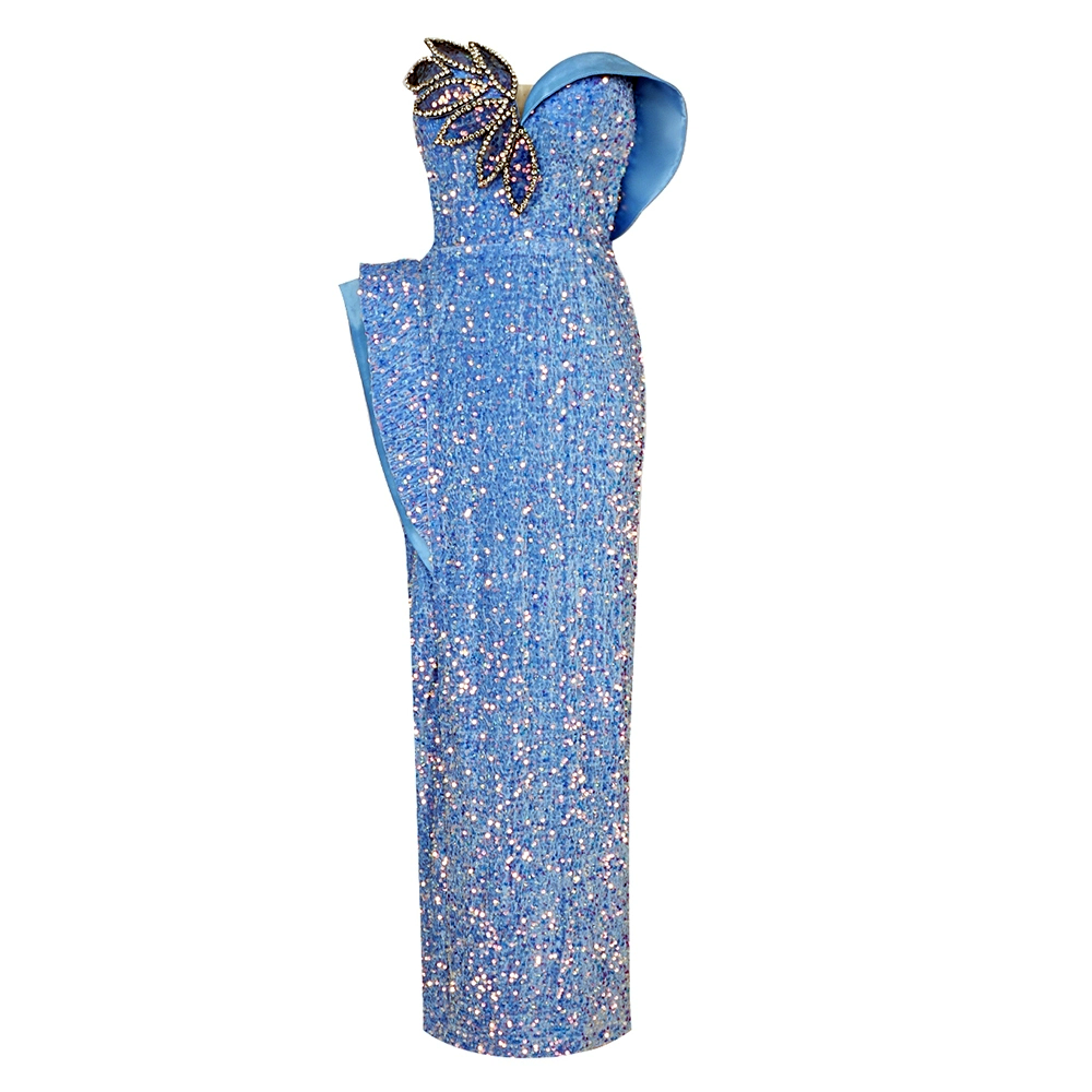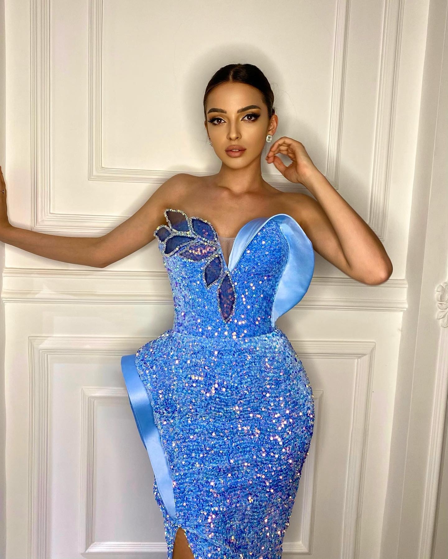 产品名称 | Product name: Blue sequin design feeling praty host bra long sexy buttocks split show thin evening dress