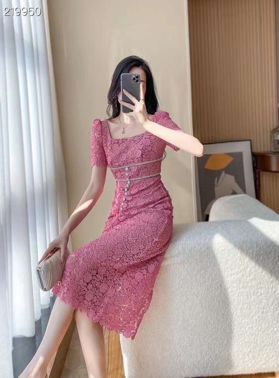 2023夏季新品方领泡泡袖水溶蕾丝连衣裙