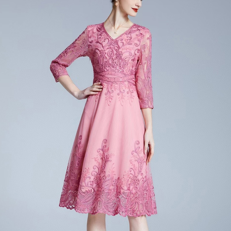 夏季新款重工盘花网纱刺绣V领收腰别致连衣裙