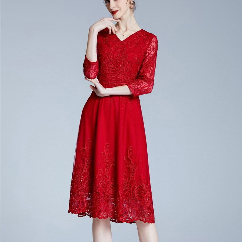 产品名称 | Product name: big size lace dress 2023 Noble V-neck Hi Mom Wedding Dress Medium Length Mesh Embroidery Young Hi Mo