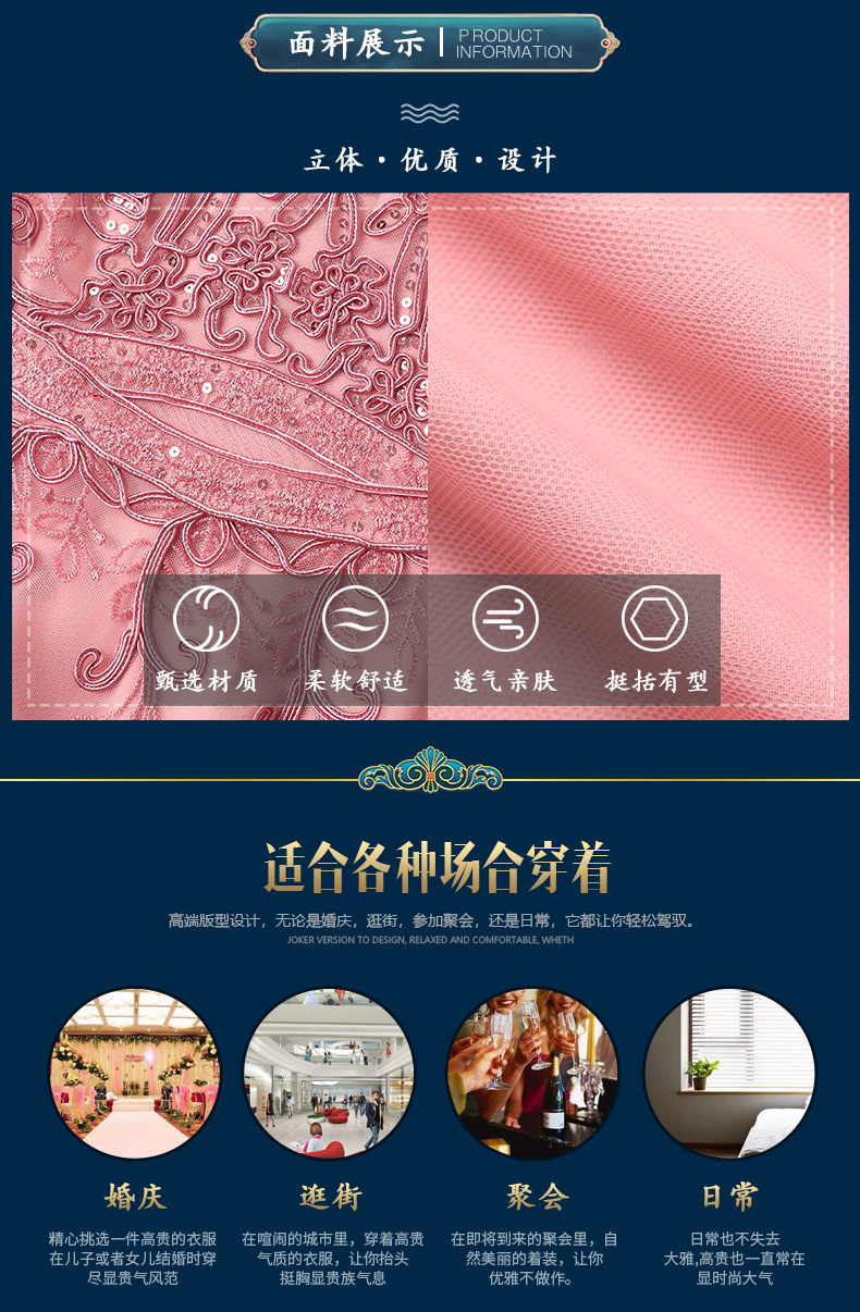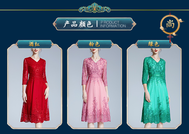 高贵V领喜妈妈婚宴装礼服 中长款网纱刺绣年轻喜婆婆婚礼连衣裙夏