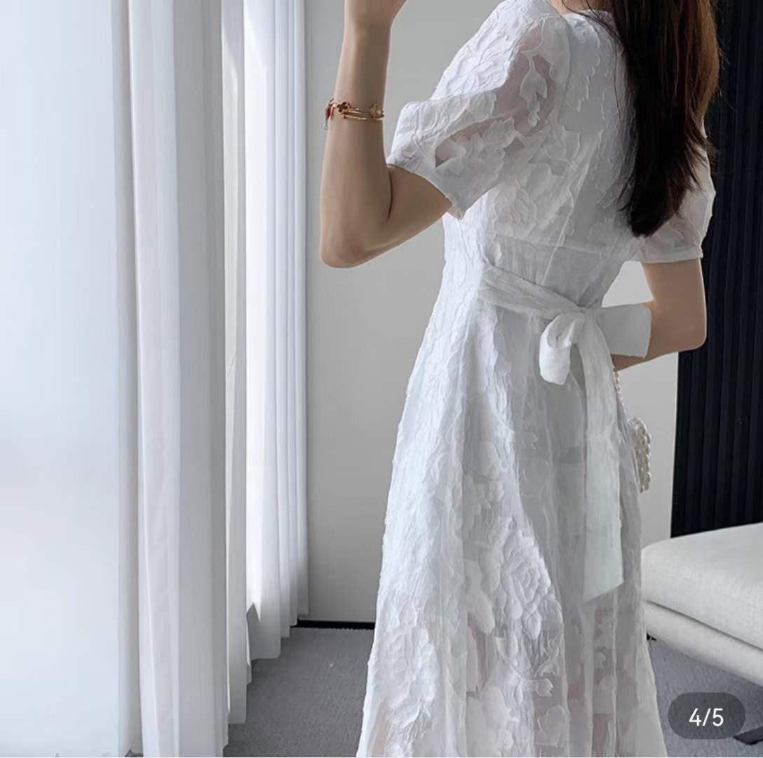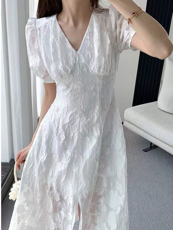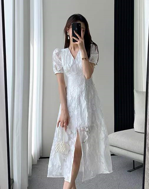 产品名称 | Product name: 2023重工定制立体浮雕法式V领开叉气质收腰白色连衣裙