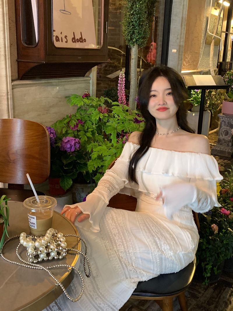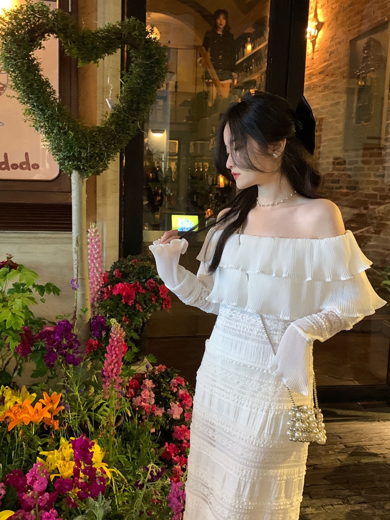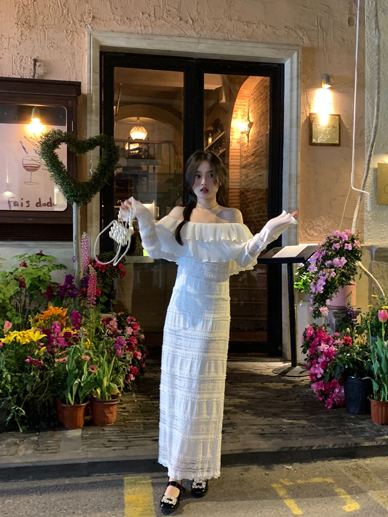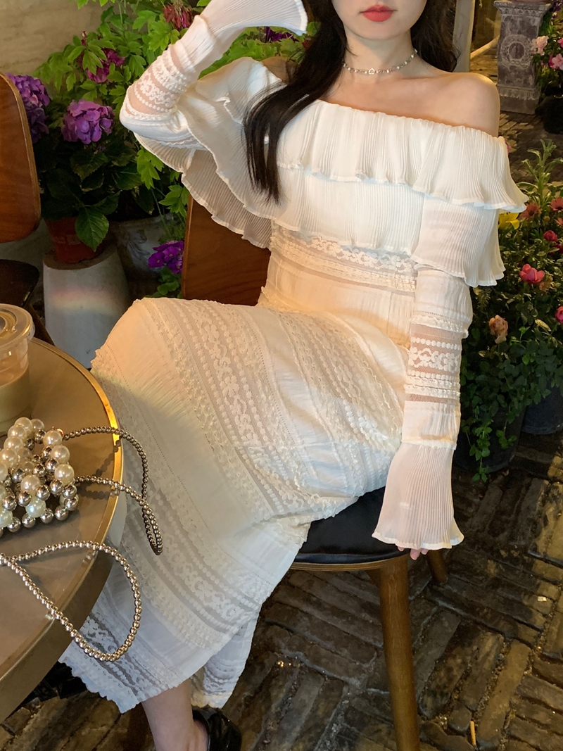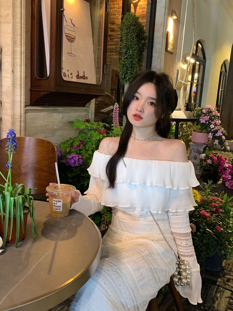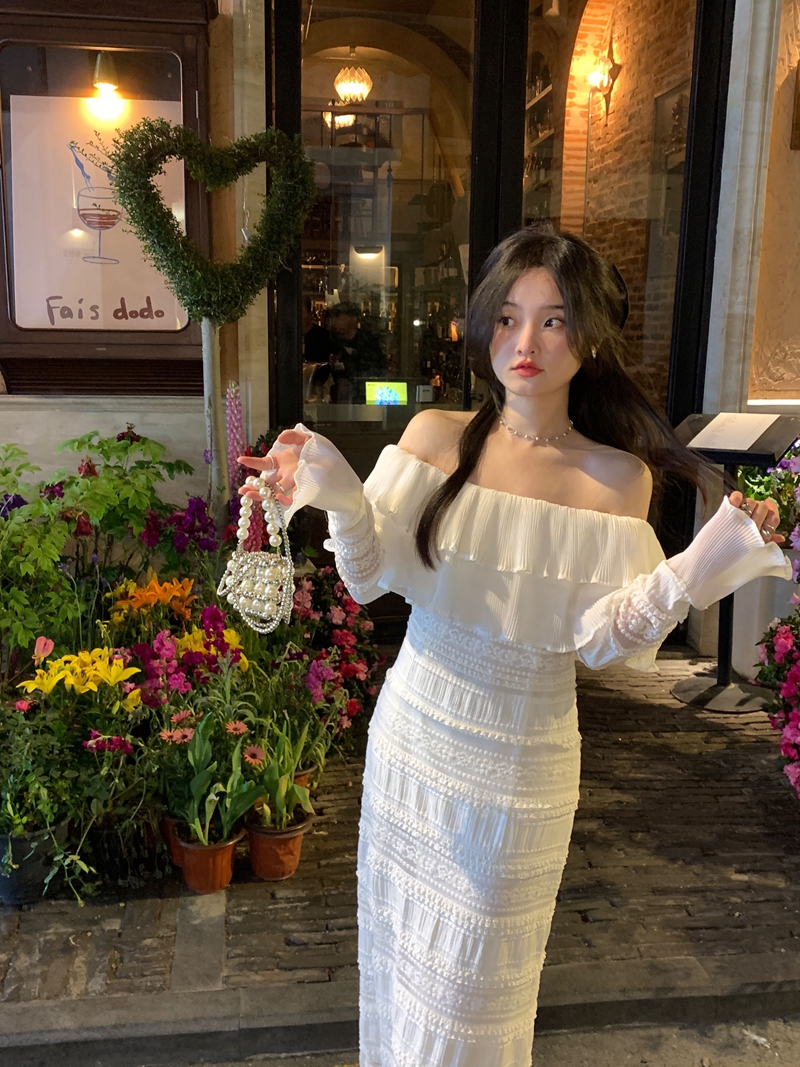 超仙名媛风粉色一字肩连衣裙女春季2023新款法式收腰显瘦小众长裙