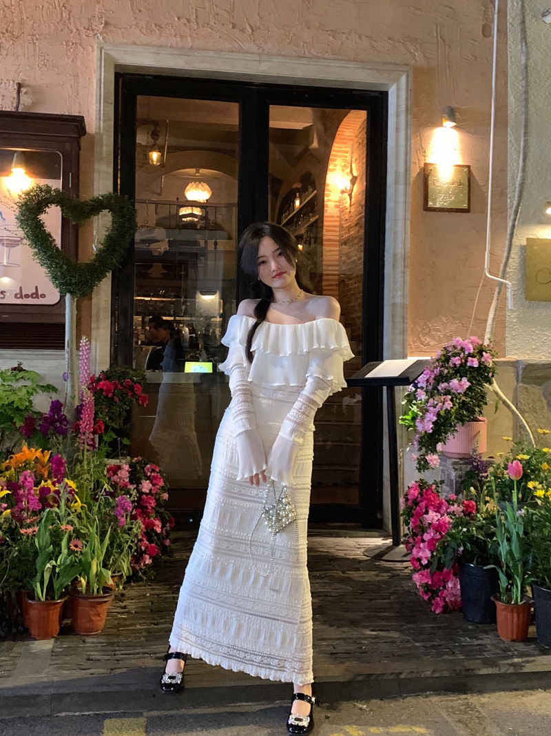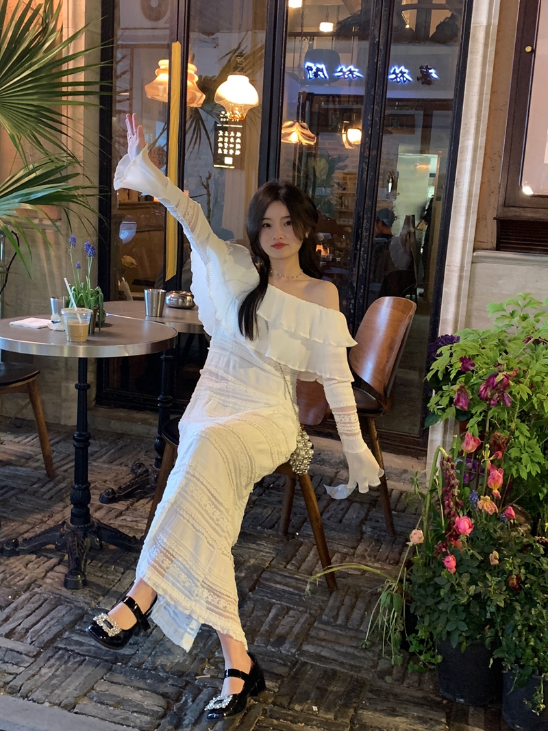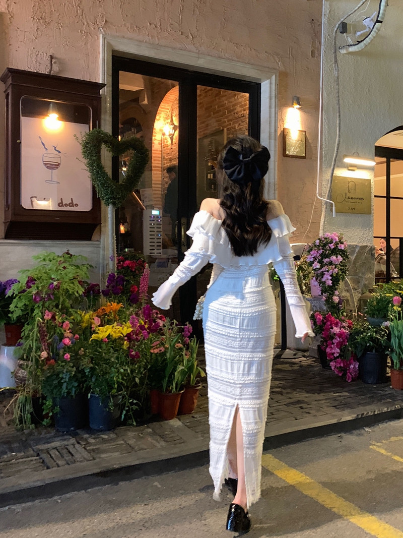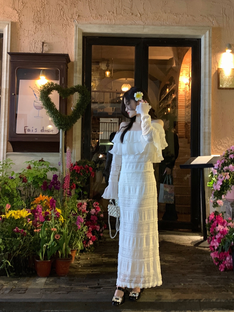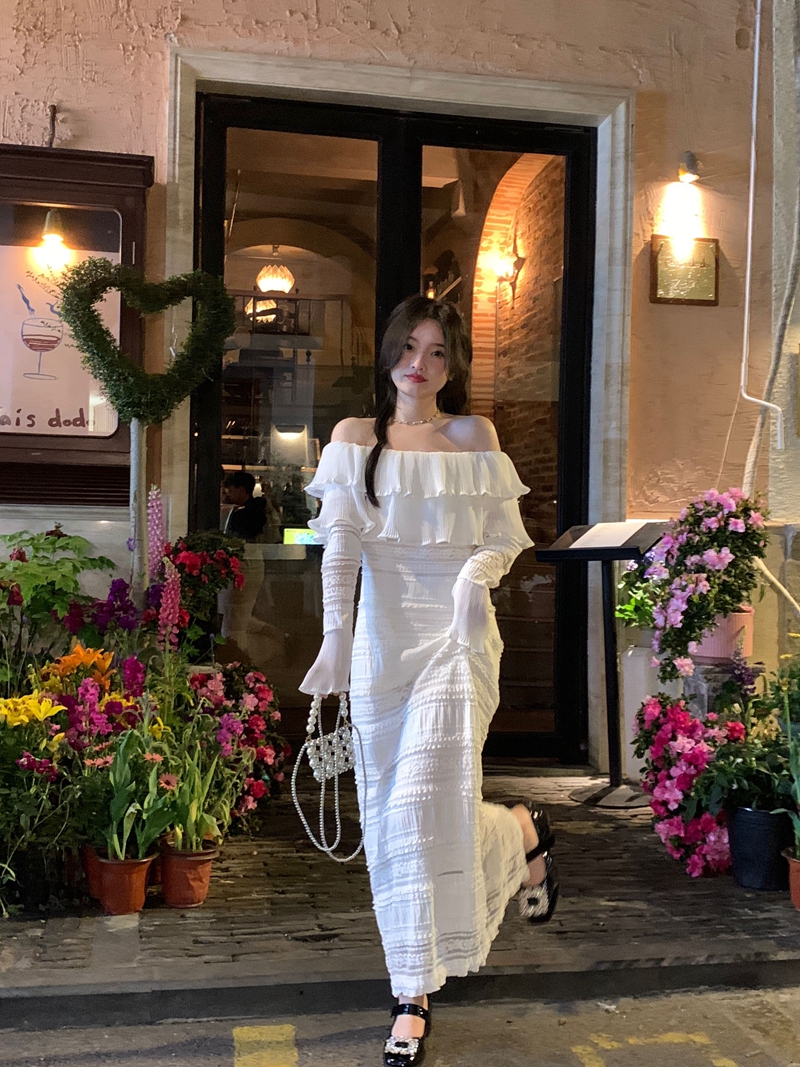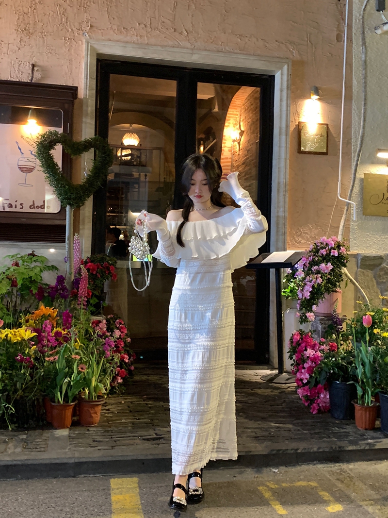 超仙名媛风粉色一字肩连衣裙女春季2023新款法式收腰显瘦小众长裙