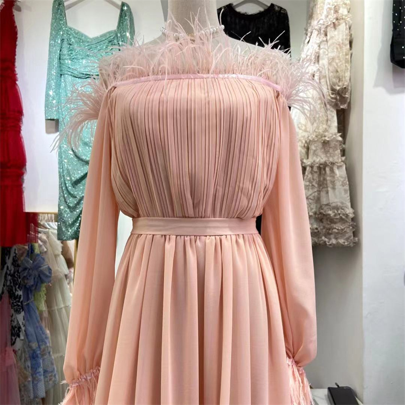 小香风轻奢精致法式羽毛拼接一字领气质女神范长裙收腰显瘦连衣裙