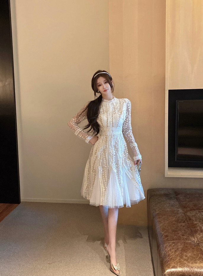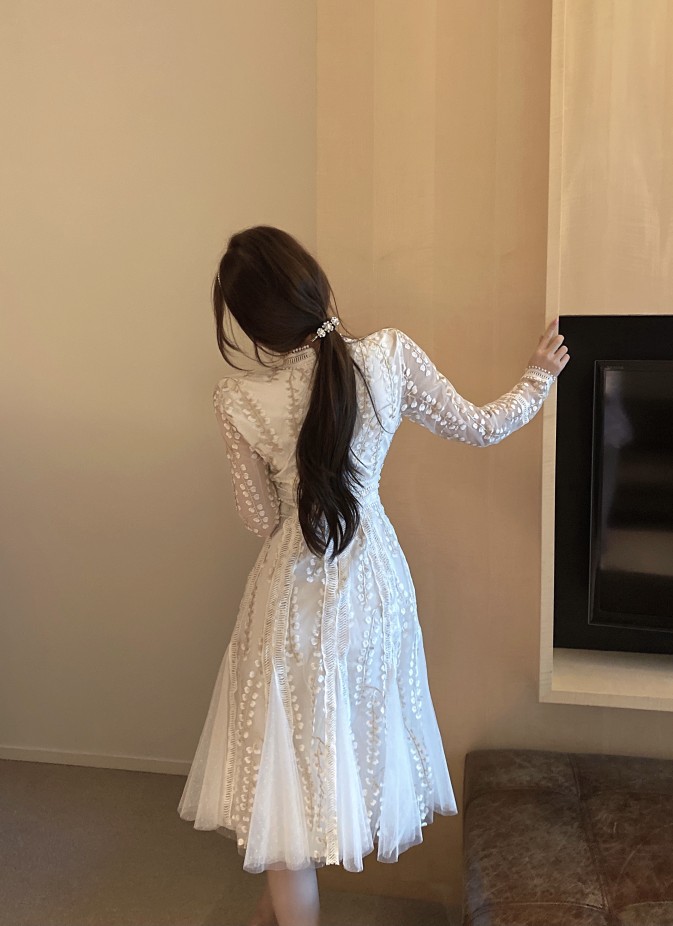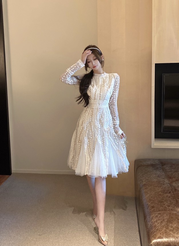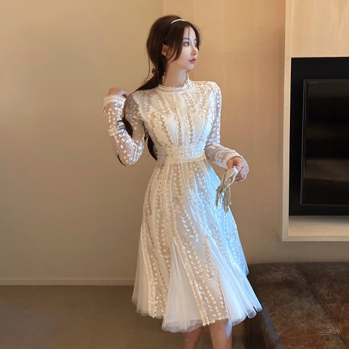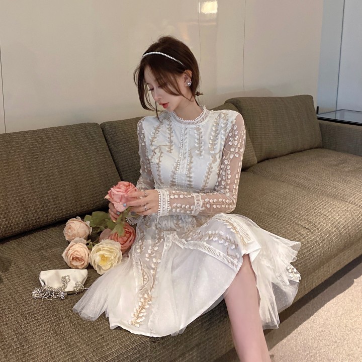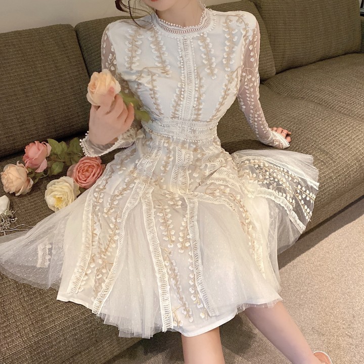 产品名称 | Product name: 2023春季新款欧美重工礼服裙收腰长裙网纱刺绣拼接水溶名媛连衣裙