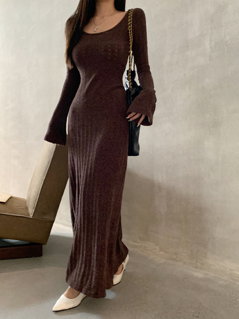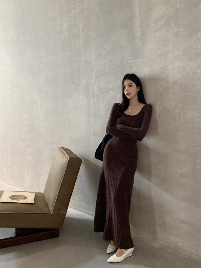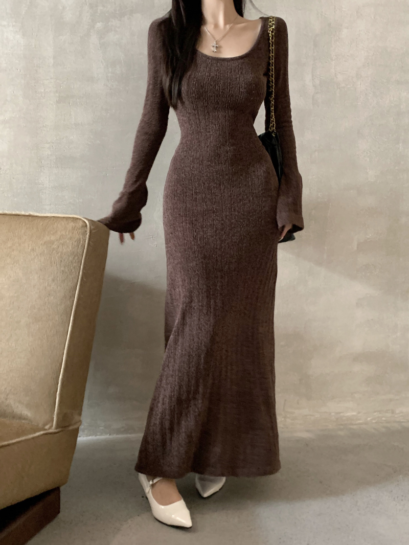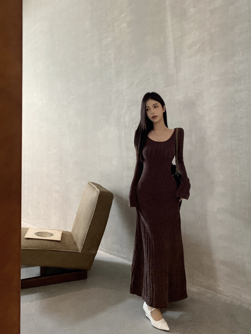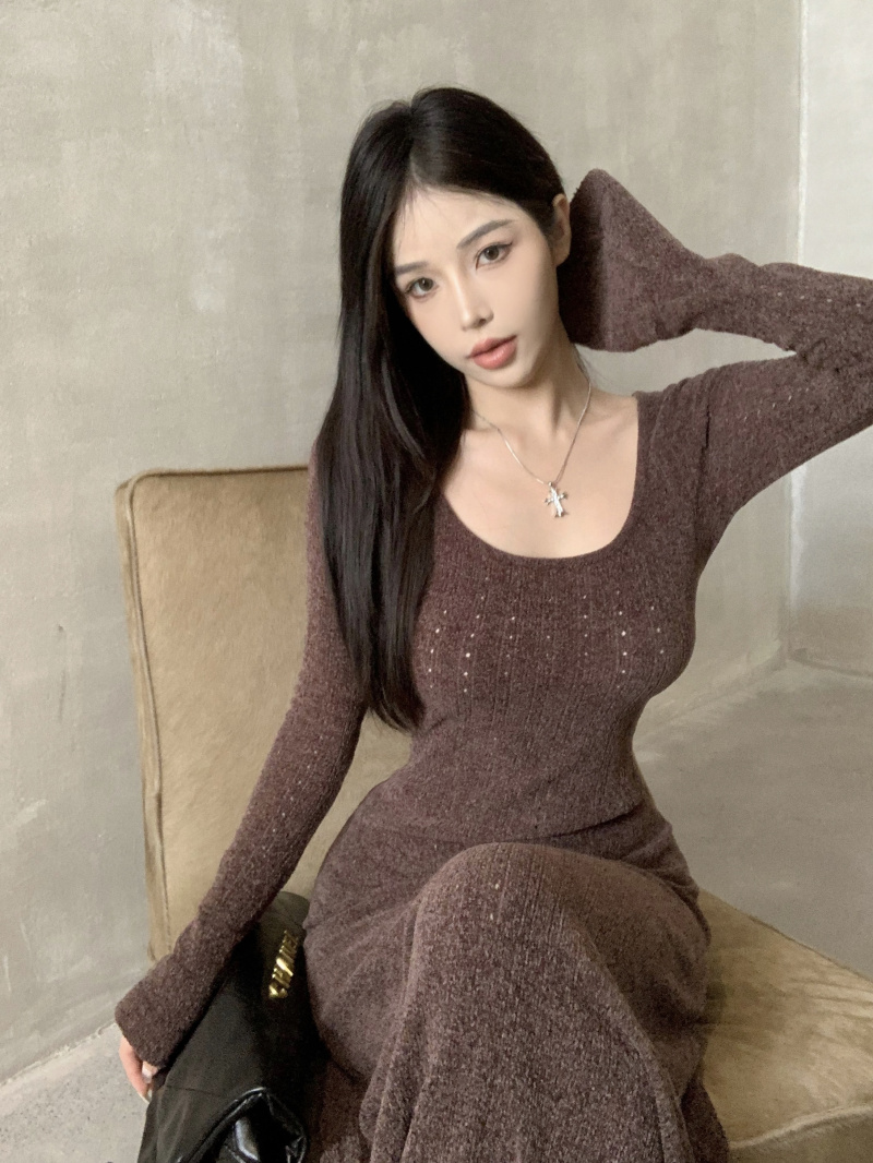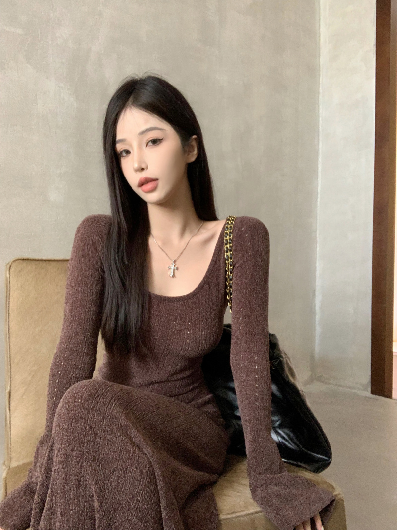 产品名称 | Product name: 三三家 咖色中长裙气质复古方领长袖连衣裙a字裙秋季女新款ins潮