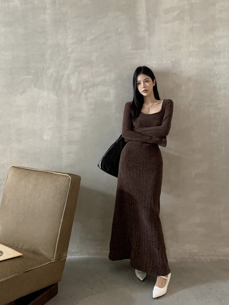 三三家 咖色中长裙气质复古方领长袖连衣裙a字裙秋季女新款ins潮