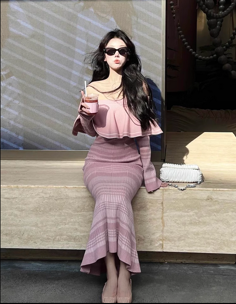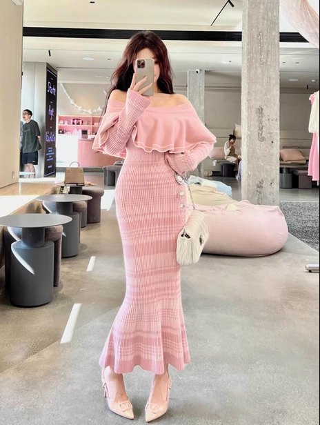 STRIVE/尤美子微胖mm法式一字肩荷叶边包臀裙秋女纯欲针织鱼尾裙