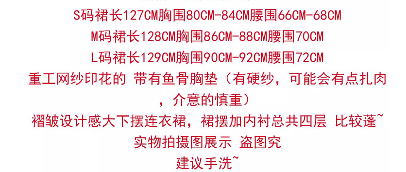 S skirt length 127CM, bust 80CM-84CM, waist 66CM-68CM M skirt length 128CM, bust 86CM-88CM, waist 70CM L skirt length 129CM, bust 90CM-92CM, waist 72CM, heavy-duty mesh print with fishbone chest pad
