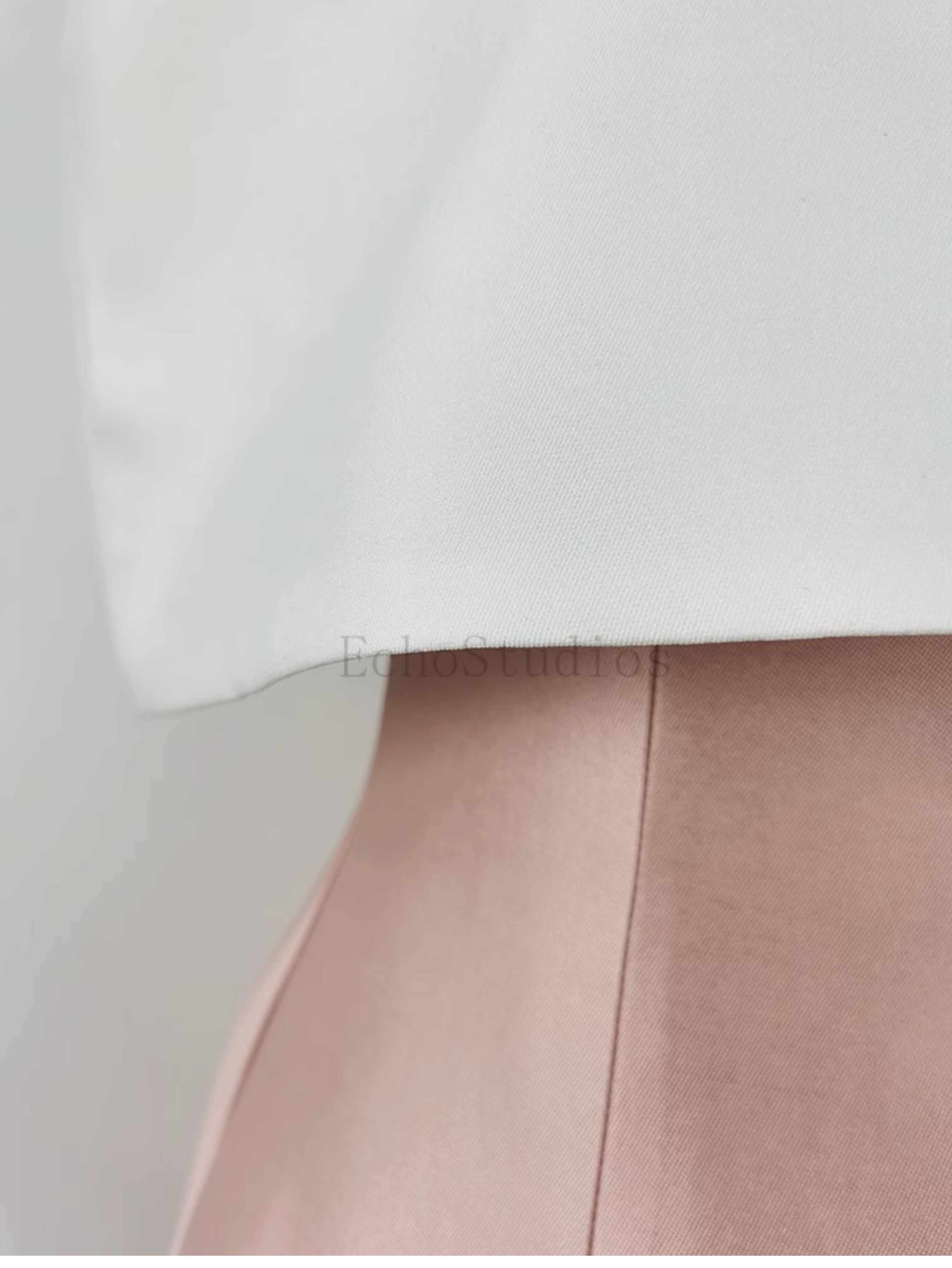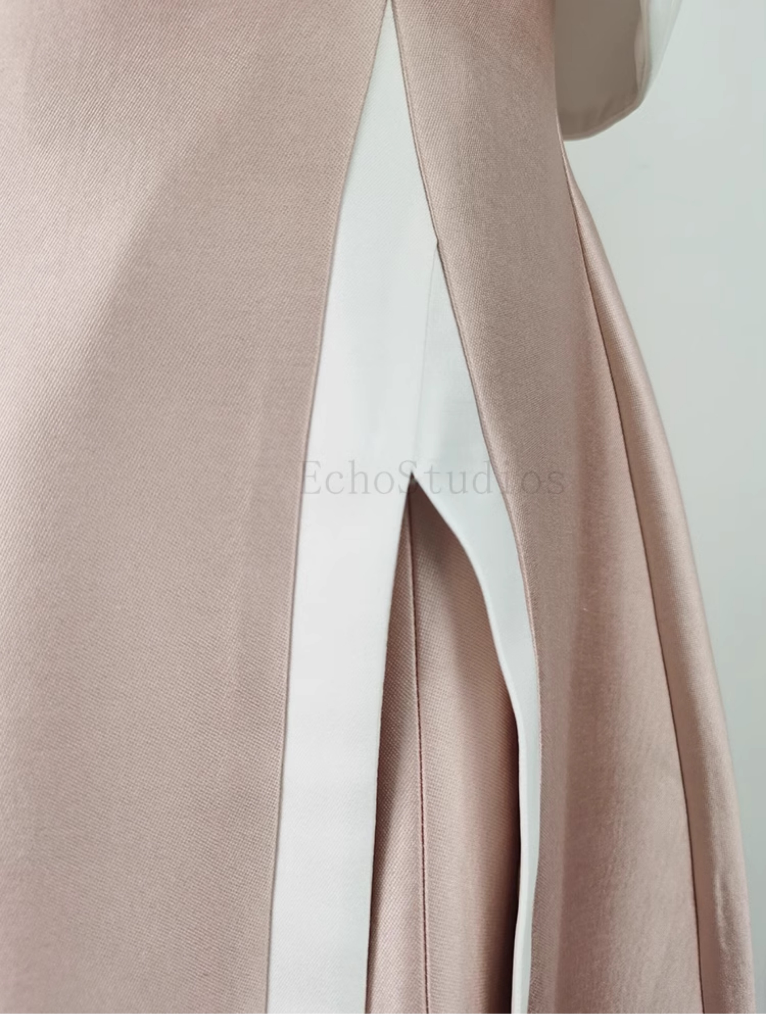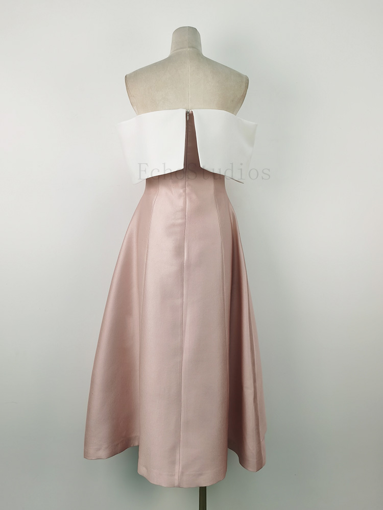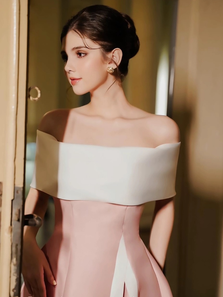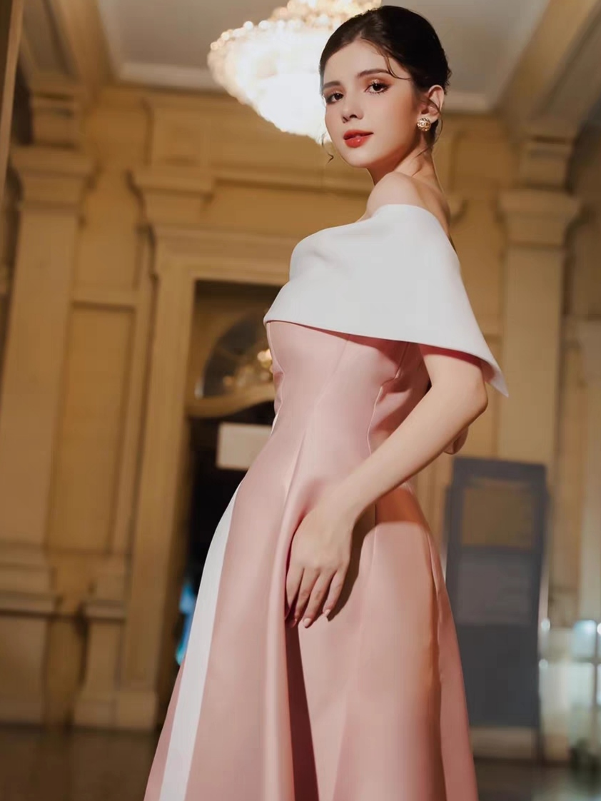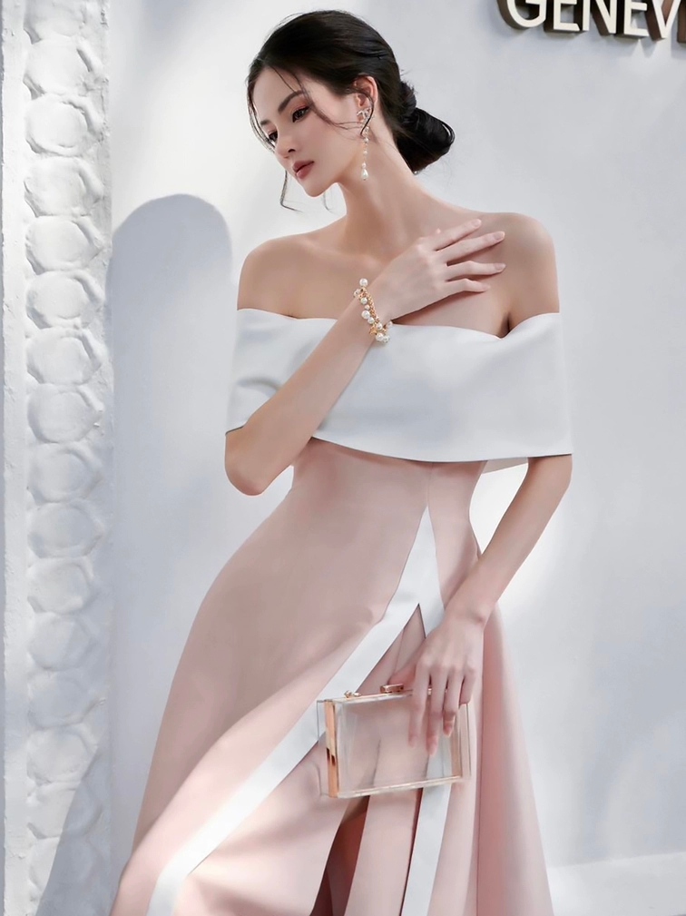 产品名称 | Product name: 越南设计师小众粉白色撞色开叉不规则小礼服大摆一字肩优雅连衣裙