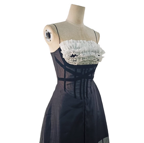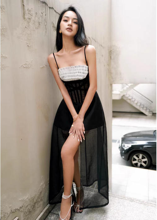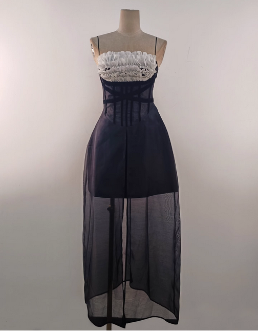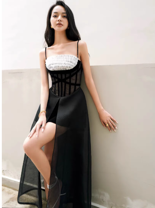 产品名称 | Product name: 越南小众气质鱼骨拼接吊带网纱连衣裙新款修身开叉黑色礼服长裙女